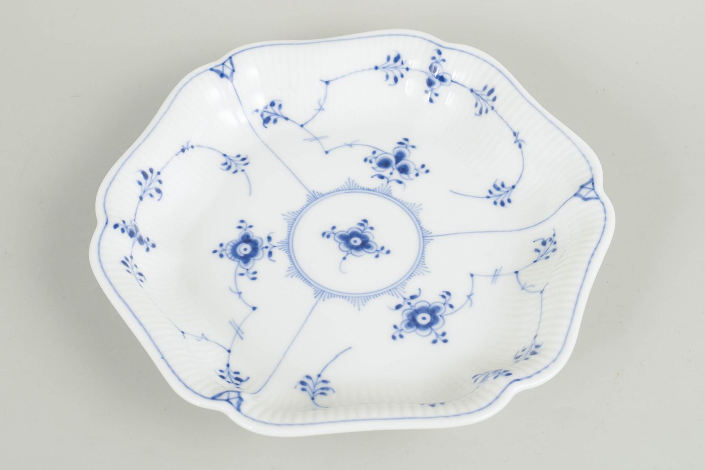 Sjældent fad i håndmalet porcelæn fra Musselmalet Riflet med klassisk underglasurdekoration i koboltblå og riflede felter. Model 1/2195. H. 4 cm, D. 23 cm. Annulleret med én indridset streg under bunden. Fremstillet i 1920’erne.