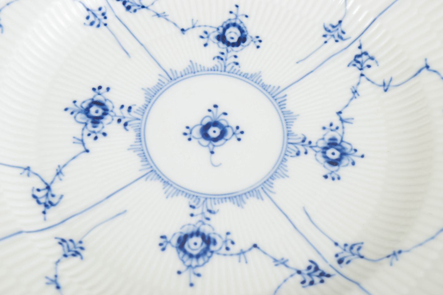 Royal Copenhagen blev grundlagt i 1775 i København under kongelig bevilling. Fabrikken er internationalt anerkendt for sit håndmalede porcelæn og sit høje kunstneriske niveau. Musselmalet Halvblonde er en videreudvikling af det klassiske Musselmalet stel, hvor riflede flader kombineres med en dekorativ blondekant og detaljeret håndmalet dekoration.