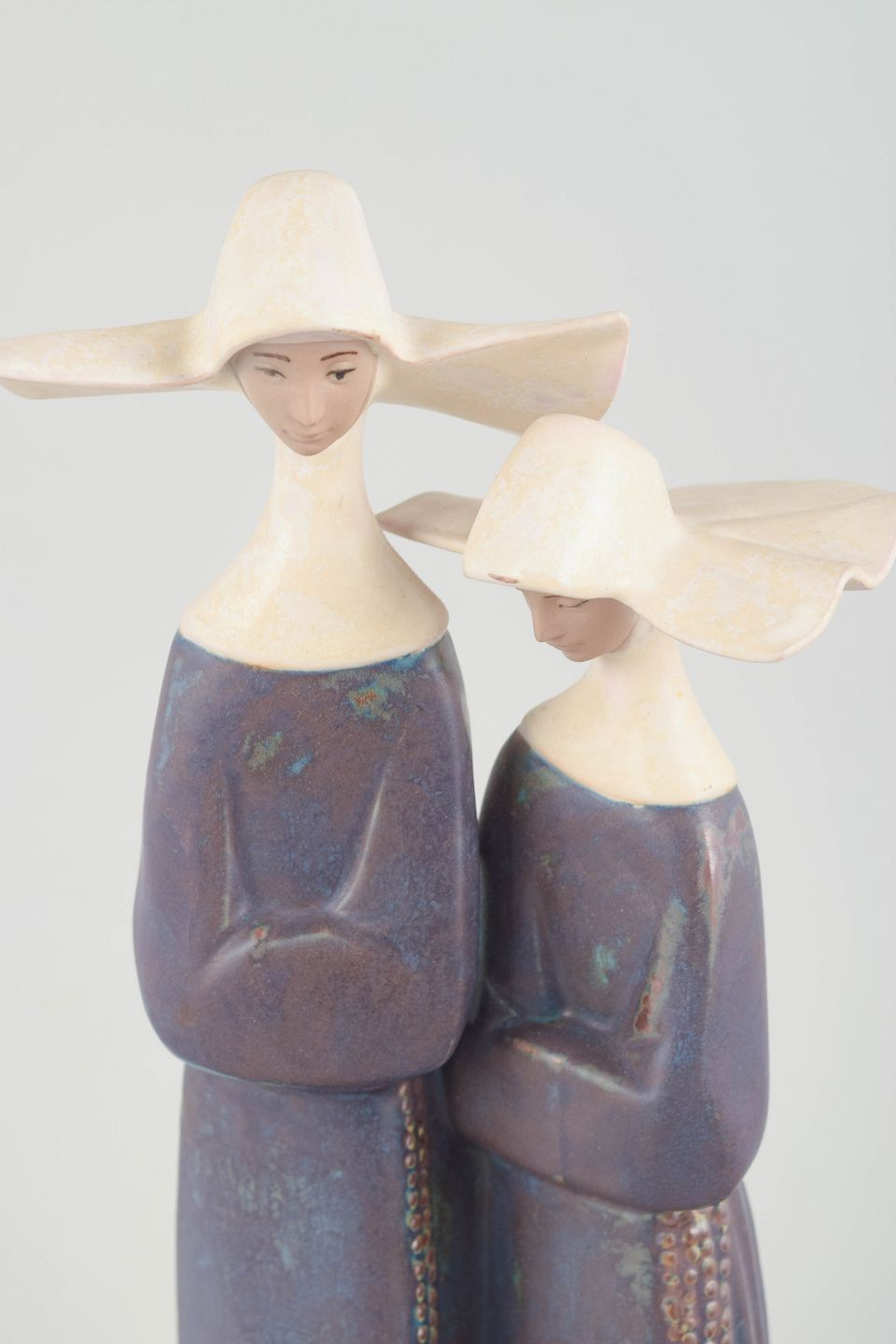 Monumental keramisk figurgruppe fra 1980’erne, fremstillet i porcelæn med karakteristisk blød modellering og afdæmpet glasur i violette og cremefarvede toner. Figuren forestiller to stiliserede kvindeskikkelser med brede hatte og elegante, vertikale kjolelinjer. Undersiden mærket Lladró, Hand Made in Spain, Daisa.