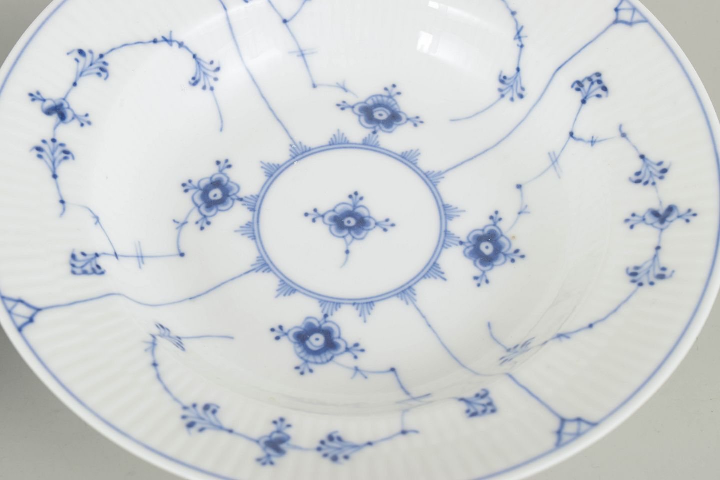 To håndmalede dybe tallerkener i Musselmalet Riflet dekoration, model 1/167, fra 1920’erne. Første sortering.