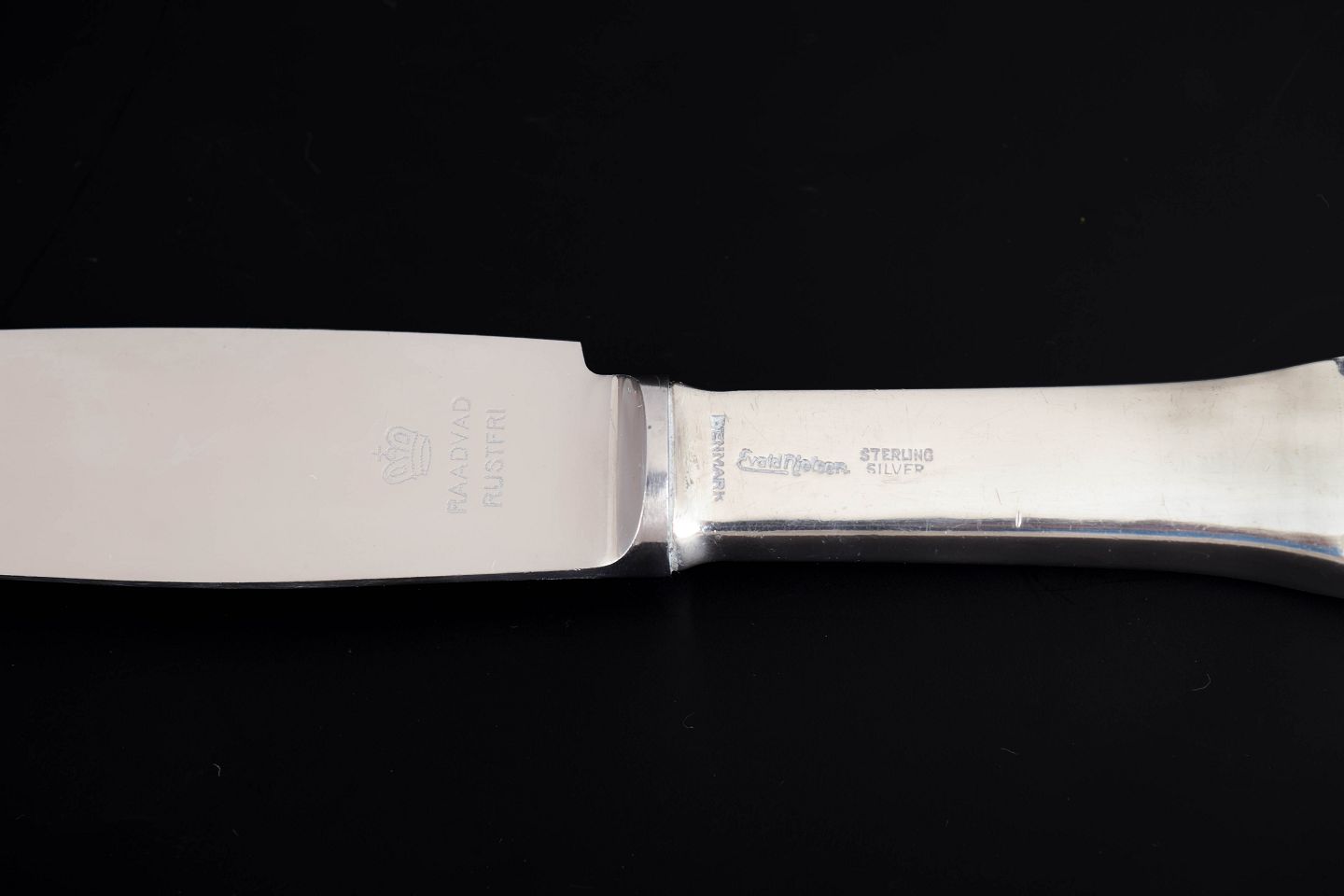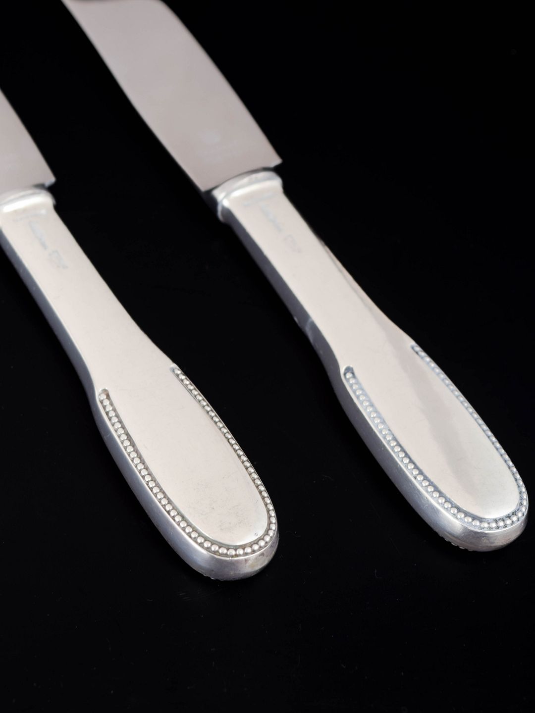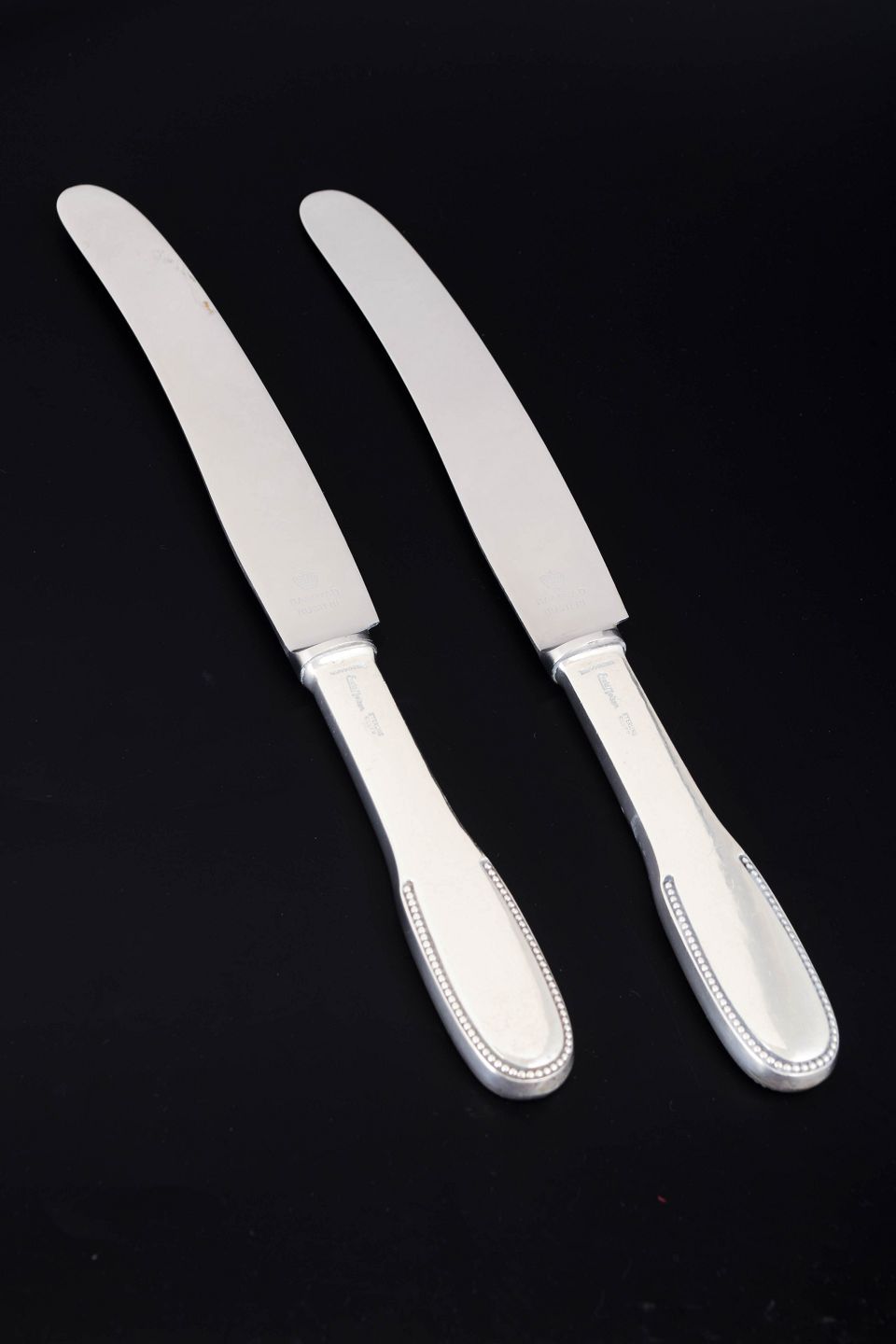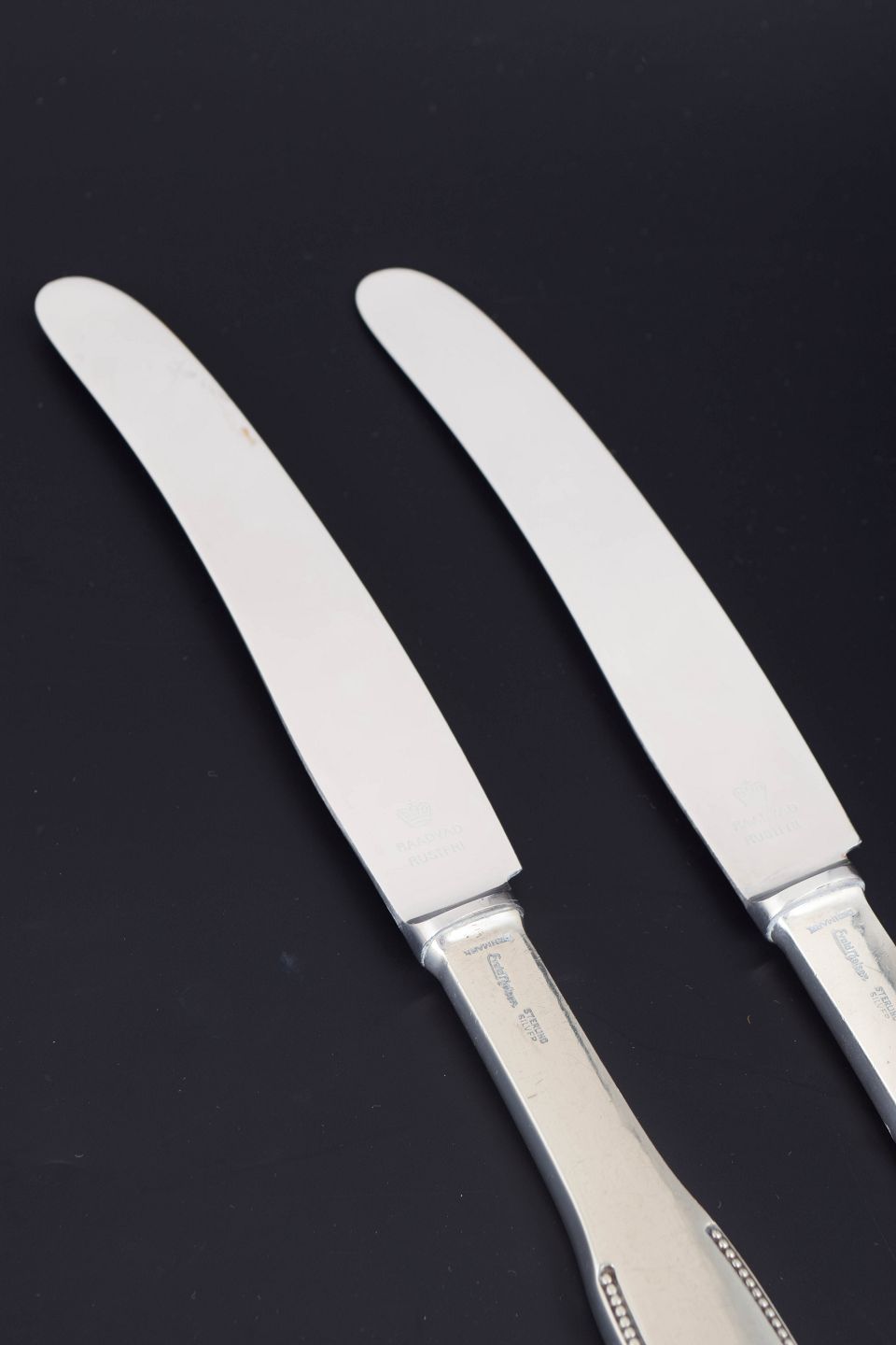 Elegante middagsknive i sterlingsølv og rustfrit stål. Model nummer 14 med klassisk, let afrundet skaftform med diskret perlekant og glat klinge. Fremstillet hos Evald Nielsen.