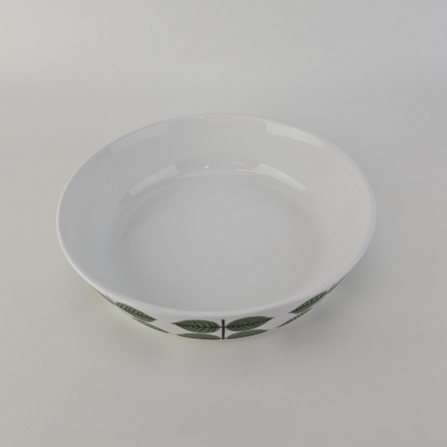 Stel i hvidt porcelæn med dekoration af grønne blade.