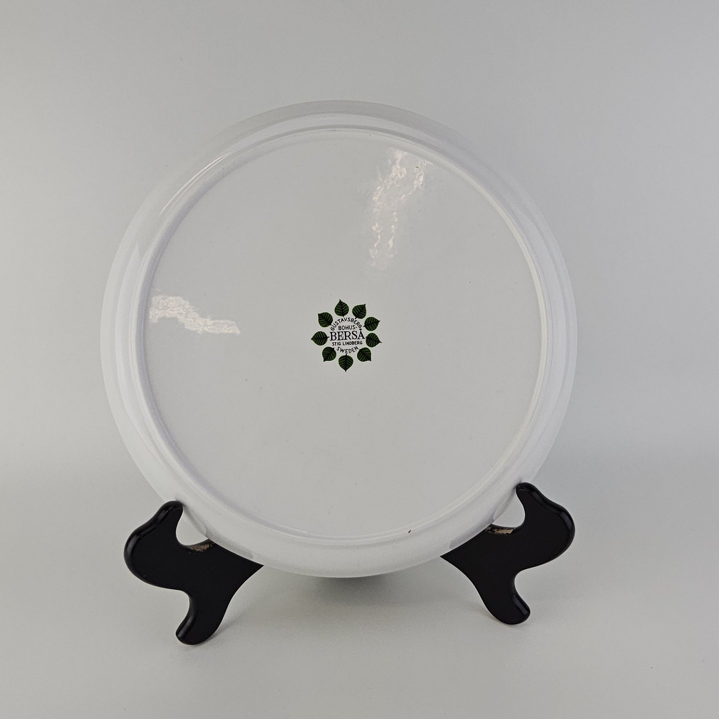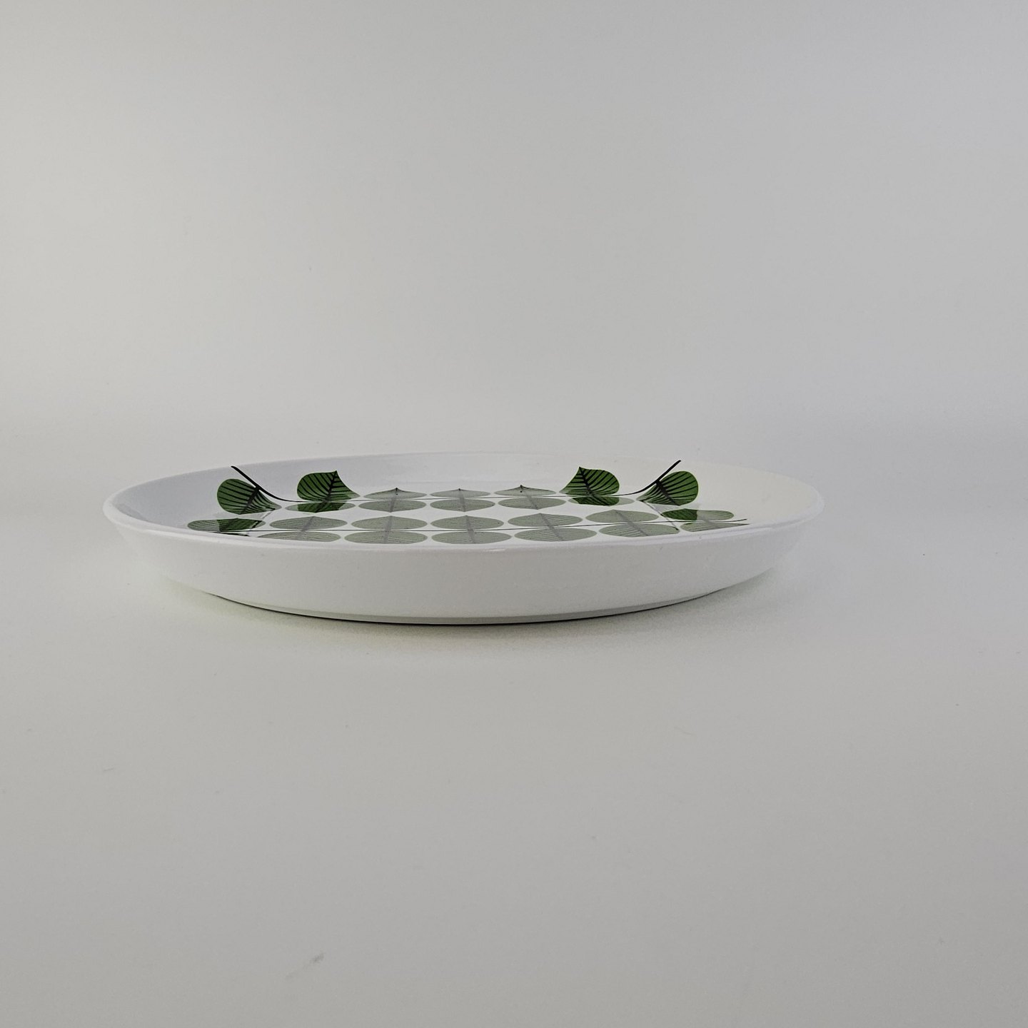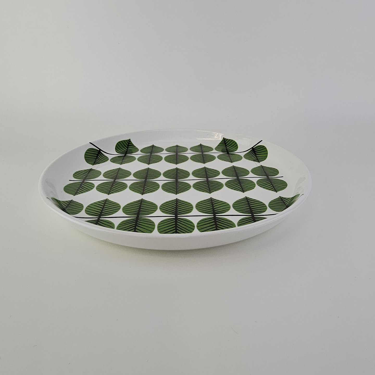 Stel i hvidt porcelæn med dekoration af grønne blade.