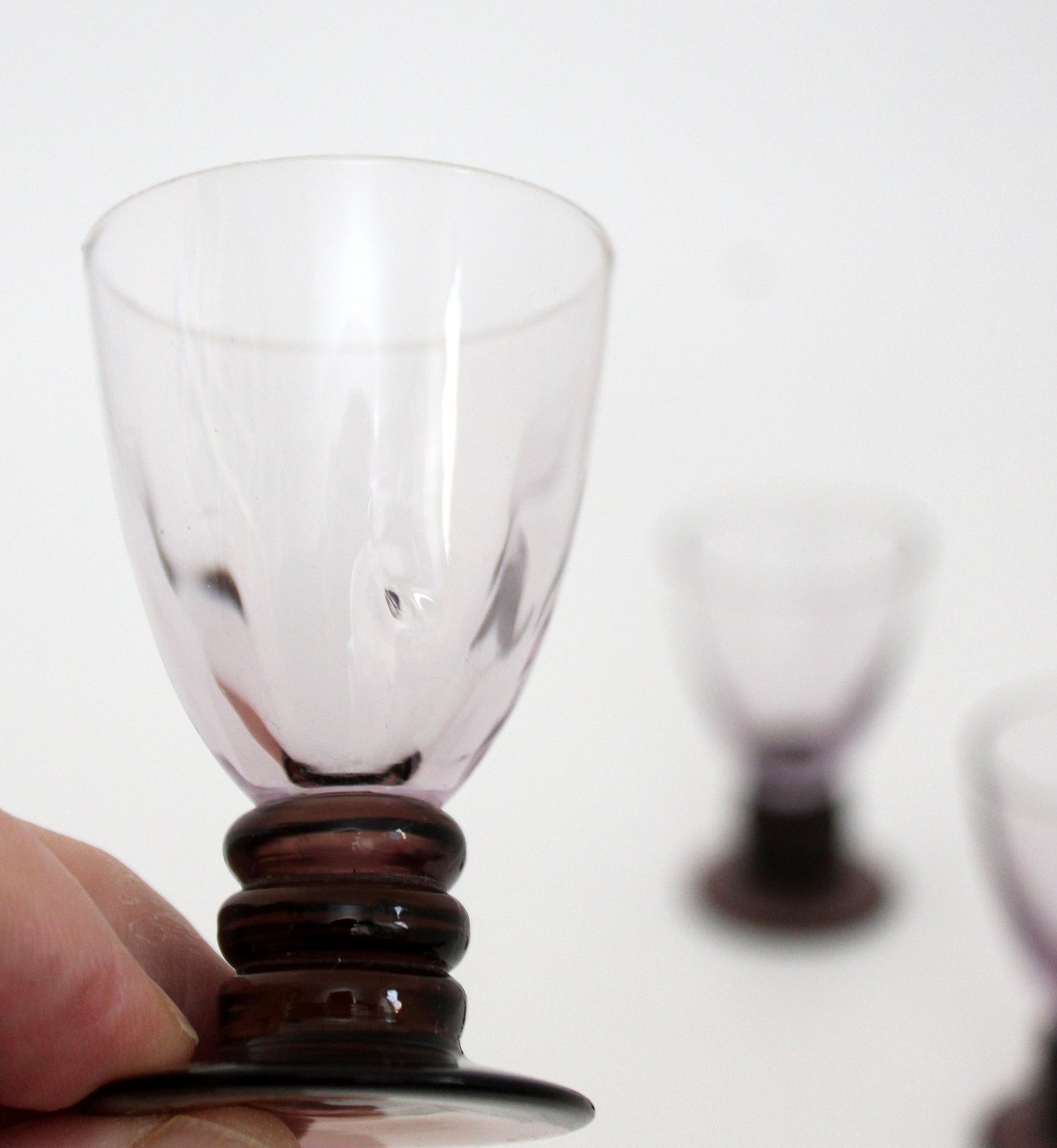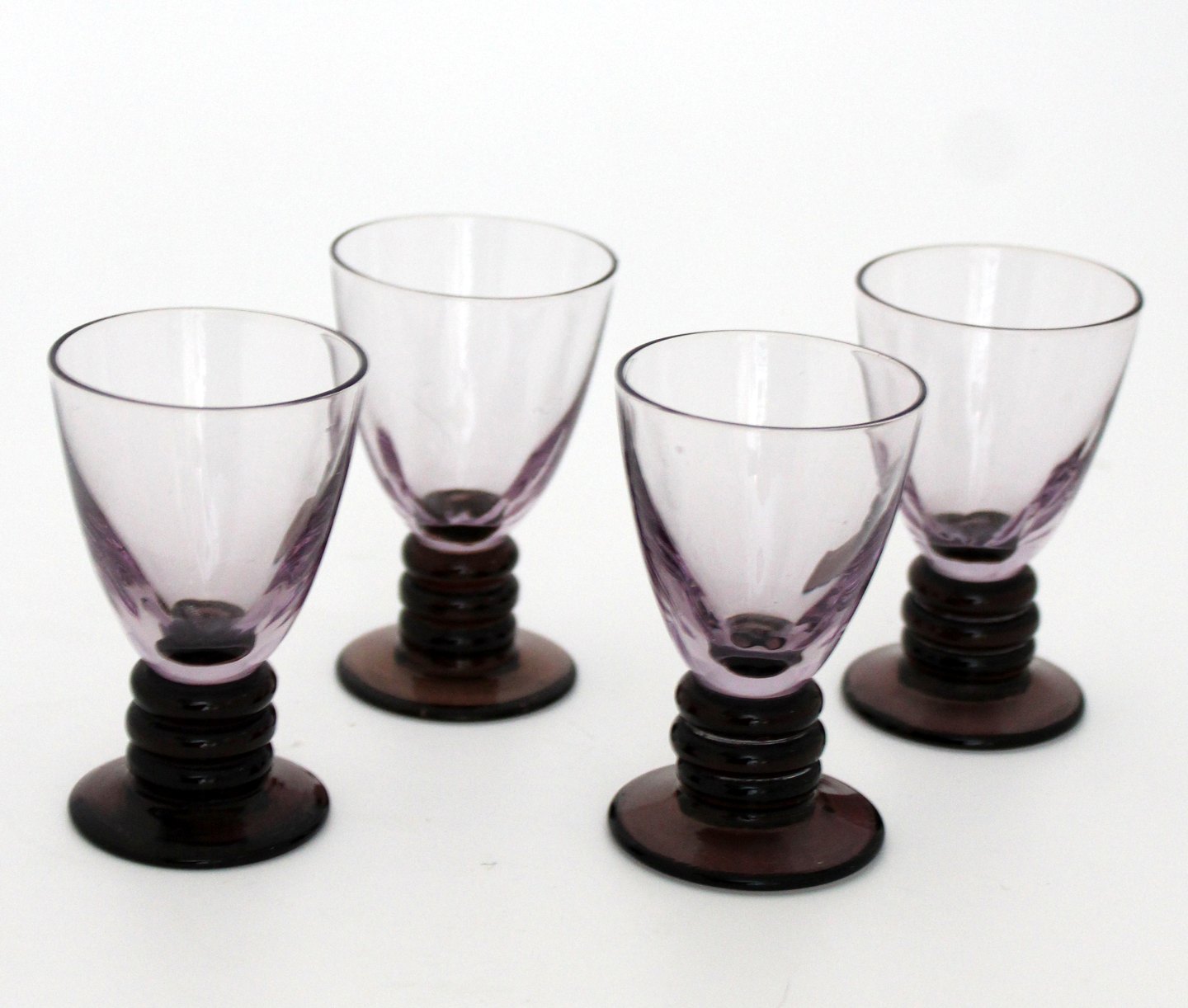 Text available in Danish: Holmegaard, Aalholm. Snapseglas, optisk stribet lilla kumme og sort fod. Designet af Jacob E Bang. Højde 7 cm. Øverste diameter 4,5 cm. Produktionsfejl på det ene af glassene, se foto. Pris: 250 kr. for sæt på 4 stk.