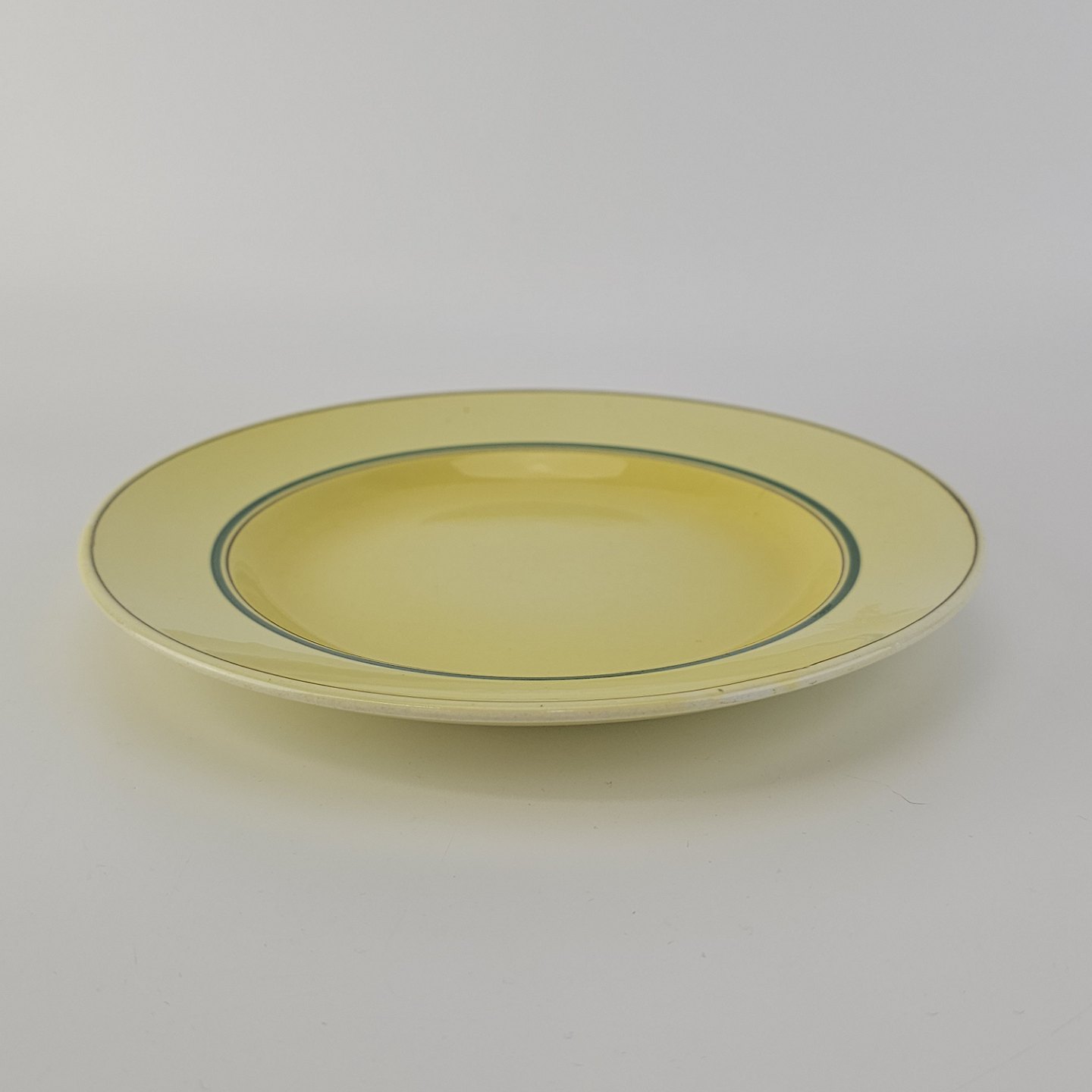 Fajancestel i stelform C med dekoration i gule nuancer med grøn stribe.
