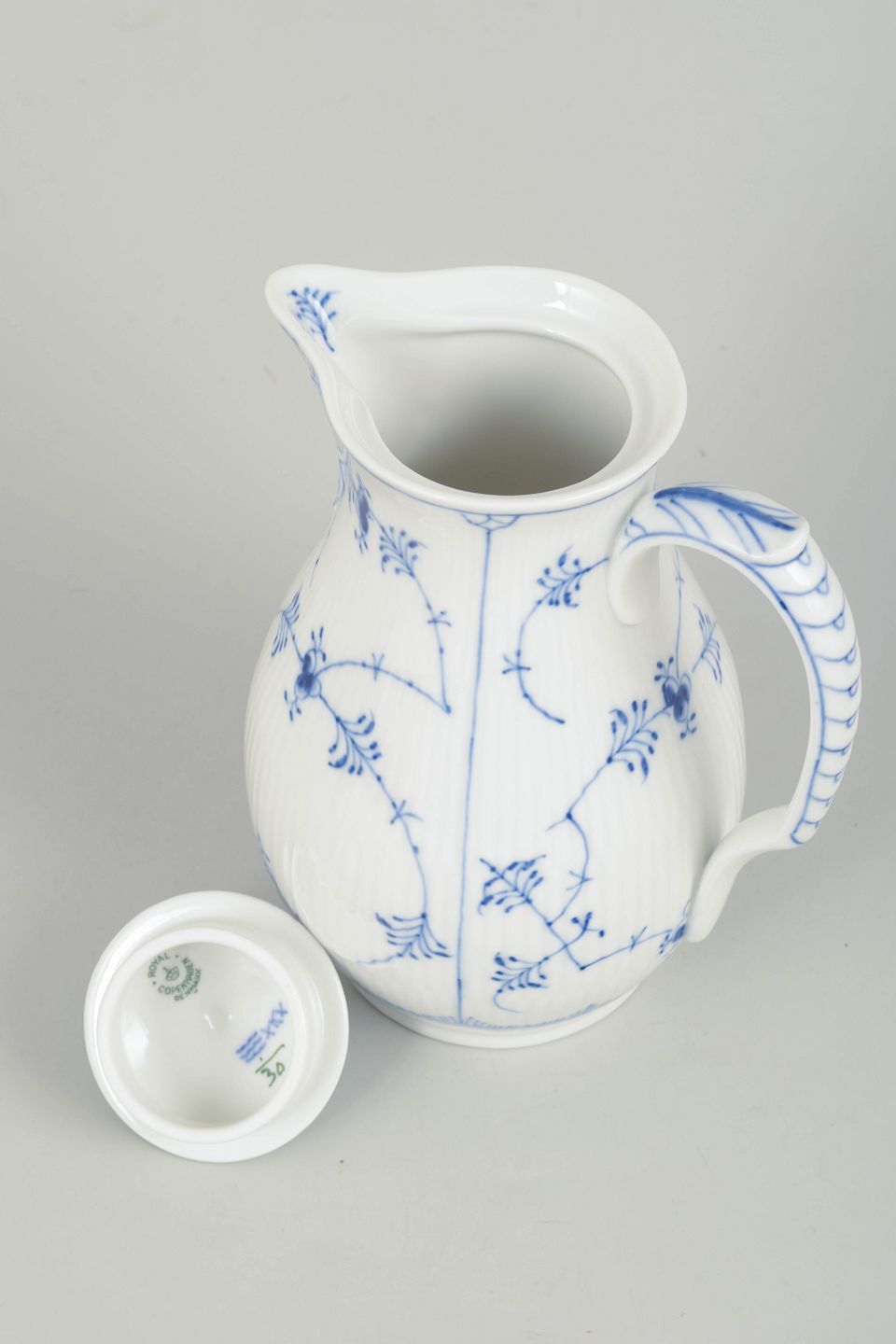 Sjælden håndmalet chokoladekande i porcelæn dekoreret med det klassiske musselmalede riflet mønster i blå underglasur. Formen har en elegant høj korpus med buet tud, svungen hank og kuppelformet låg med knop. Undersiden er fabriksstemplet Royal Copenhagen, første sortering. Model 1/30.