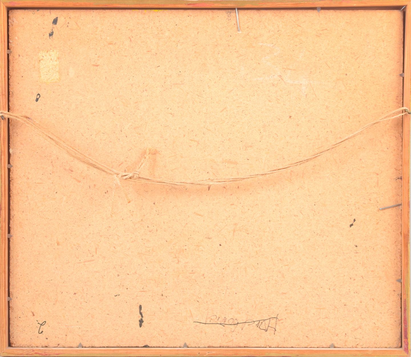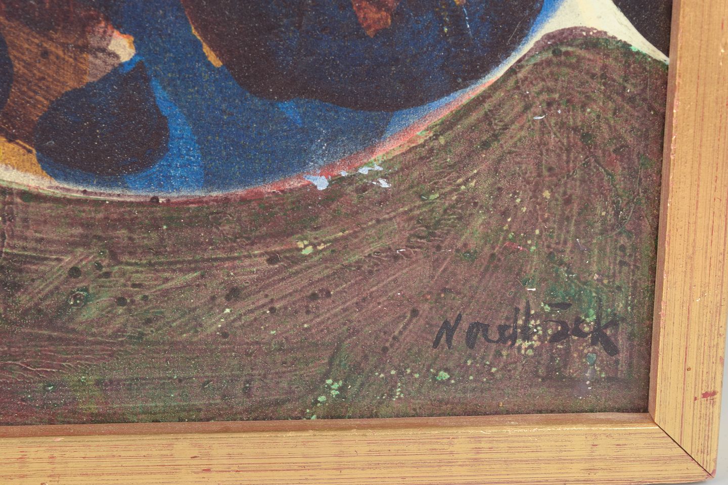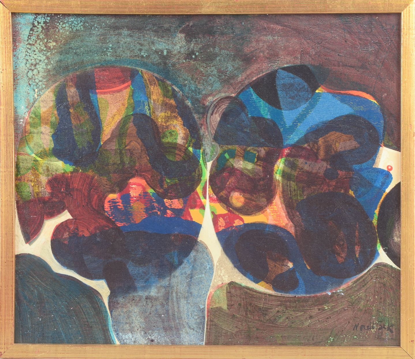 Abstrakt komposition udført i olie på plade med organiske former og stærke farvefelter i blå, røde, grønne og gule toner. De overlappende former og kontrasterende farver skaber en dynamisk billedflade med tydelige spor af 1970’ernes nordiske modernisme.