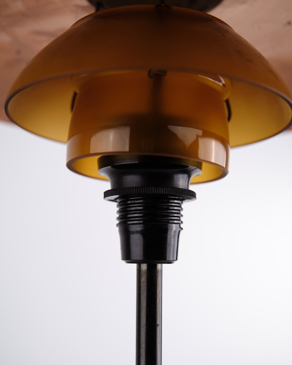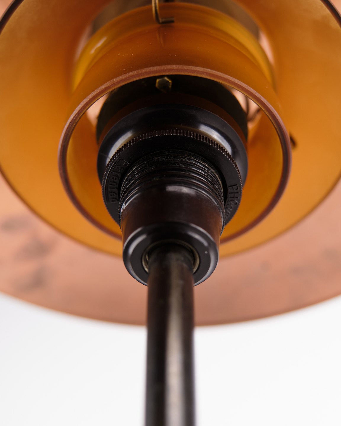 PH 3,5/2 bordlampe designet af Poul Henningsen og fremstillet af Louis Poulsen i 1930’erne. Lampen er udført med overskærm i kobber, ravfarvede glasskærme og fod i bruneret messing.
