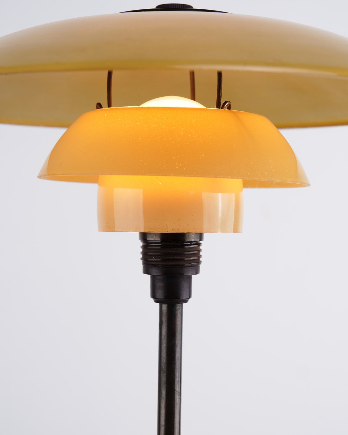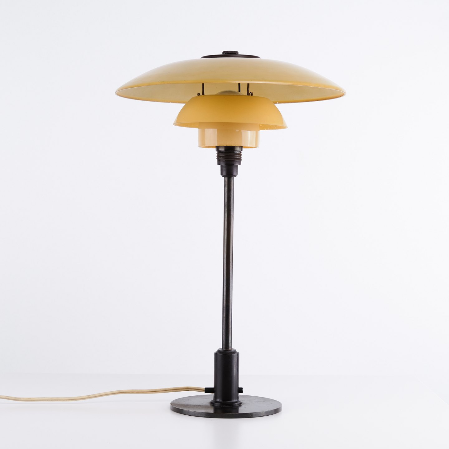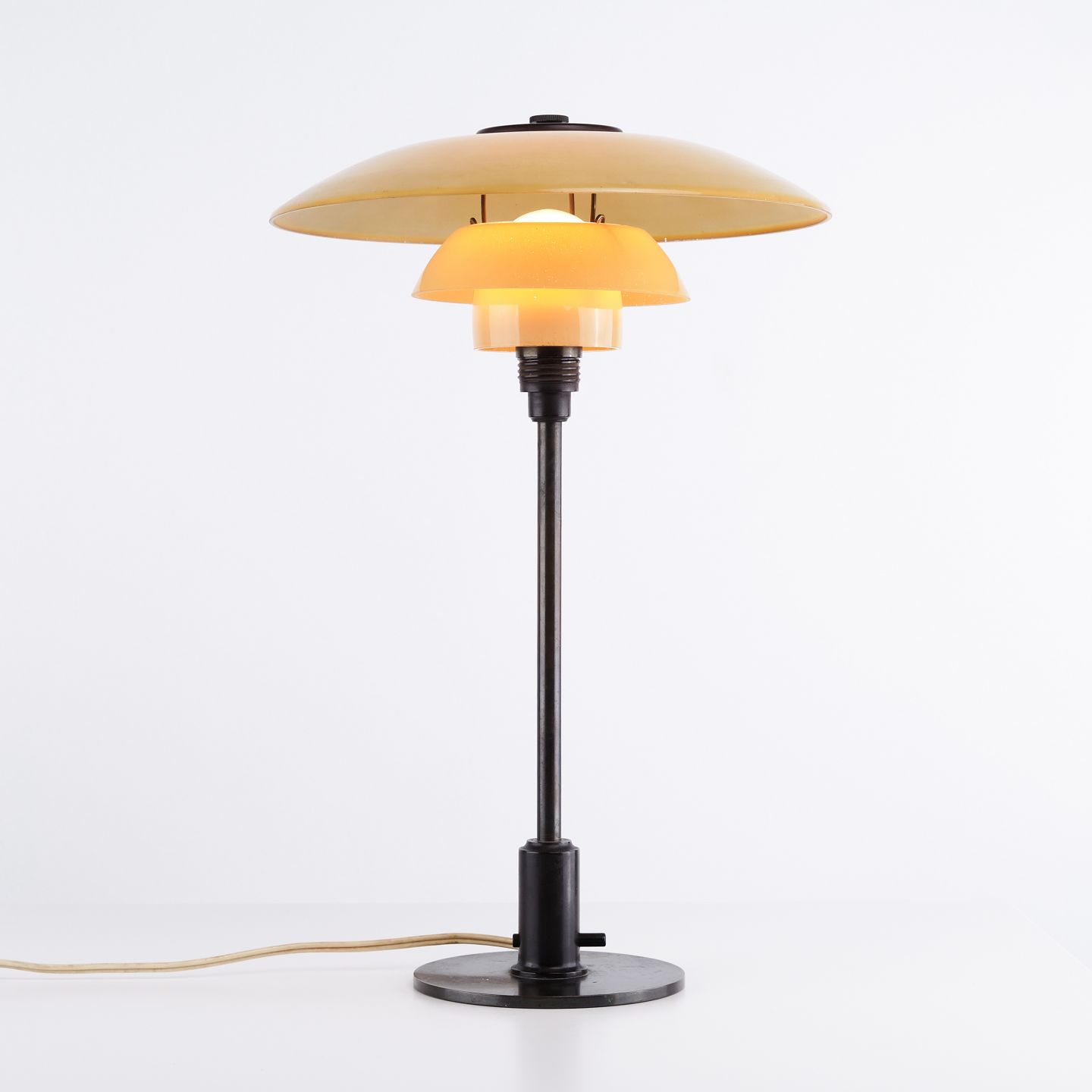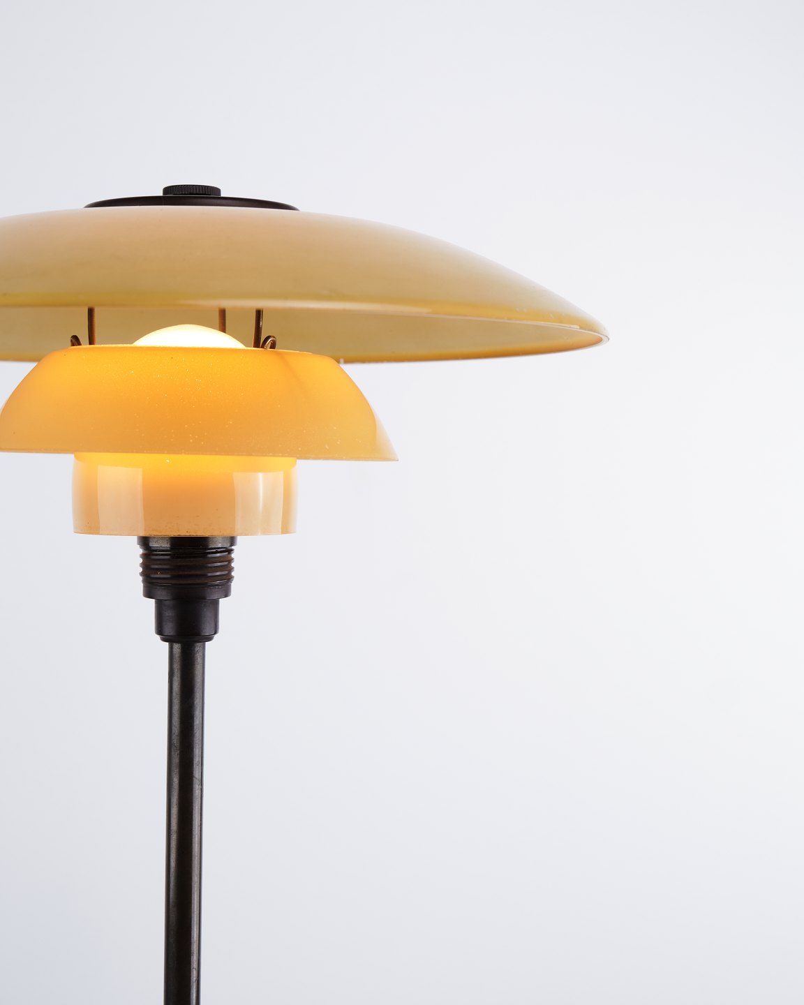 PH 3/2 bordlampe designet af Poul Henningsen og fremstillet af Louis Poulsen i 1930’erne. Lampen er udført med 1-lags gulmalede skærme, som giver et varmt og behageligt lys. Det ikoniske treskærmssystem er udviklet til at sikre optimal lysfordeling og minimere blænding.