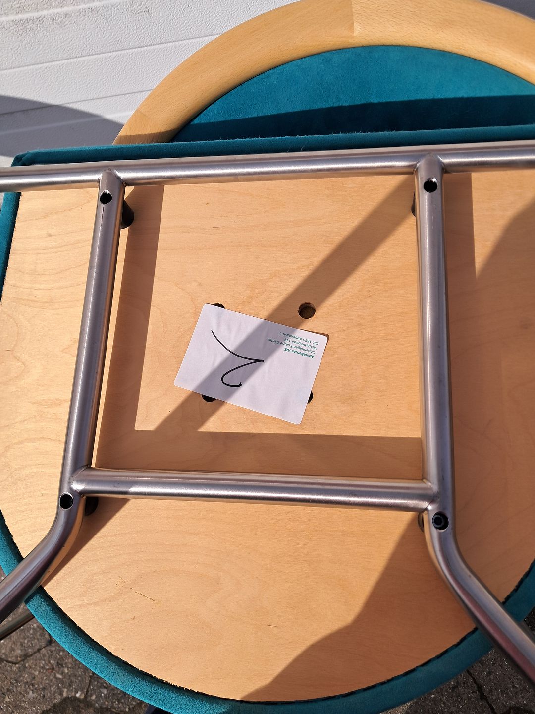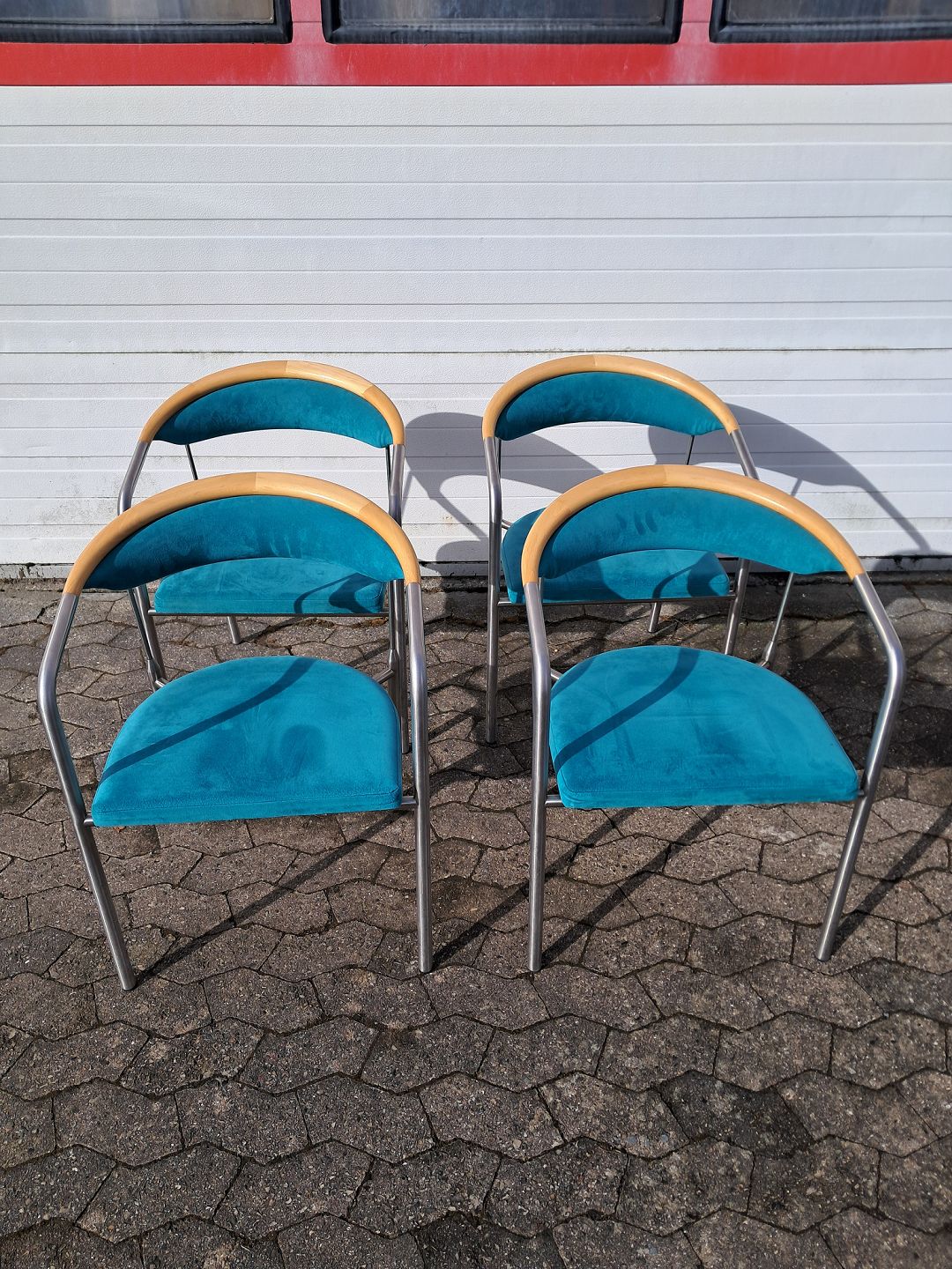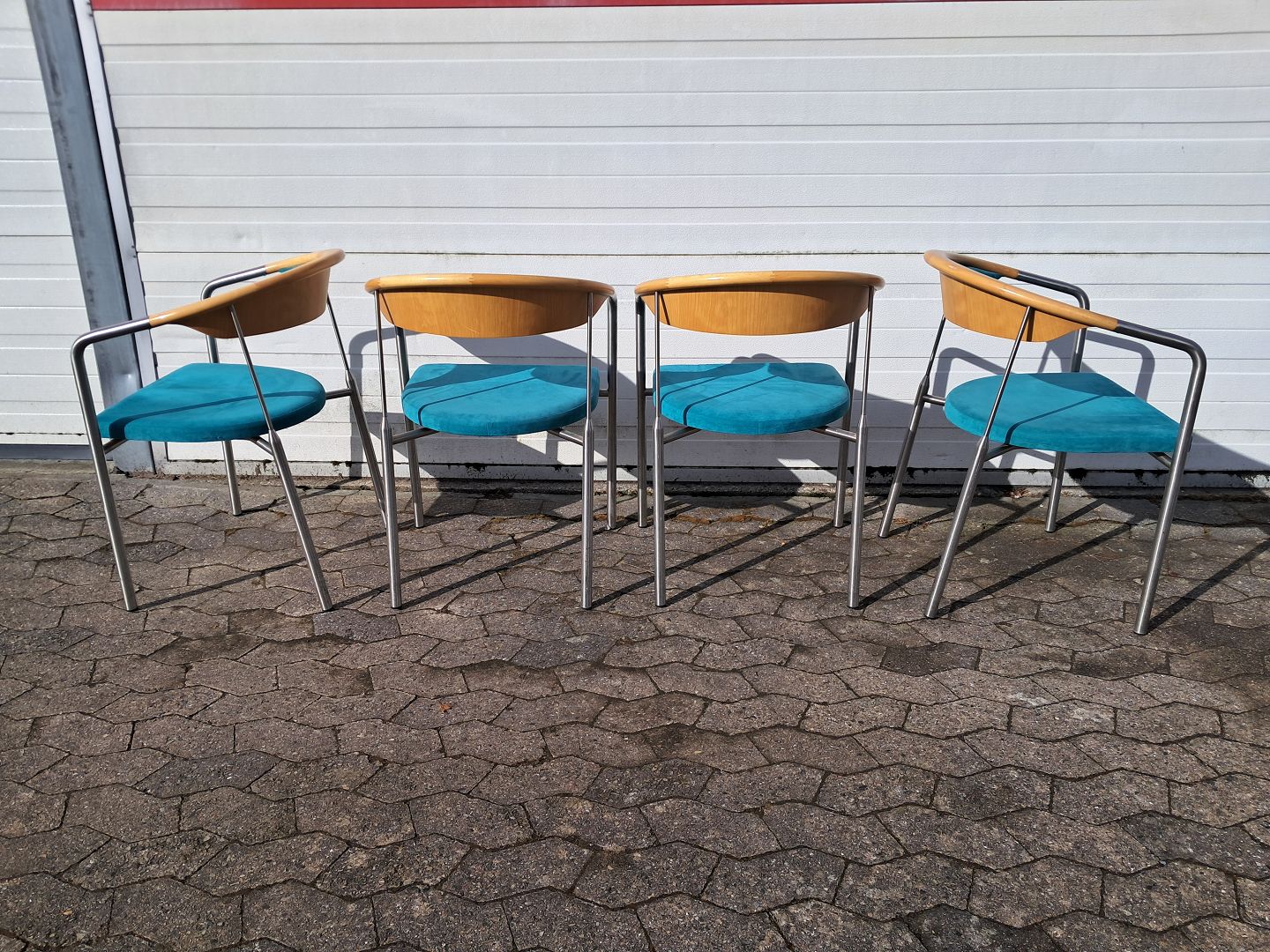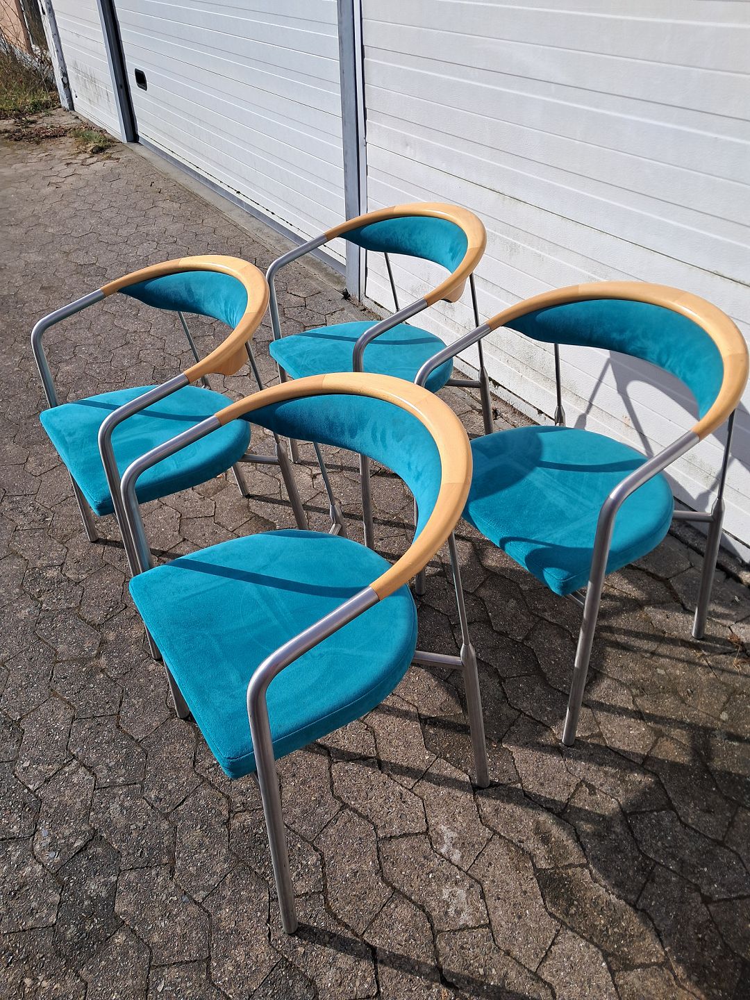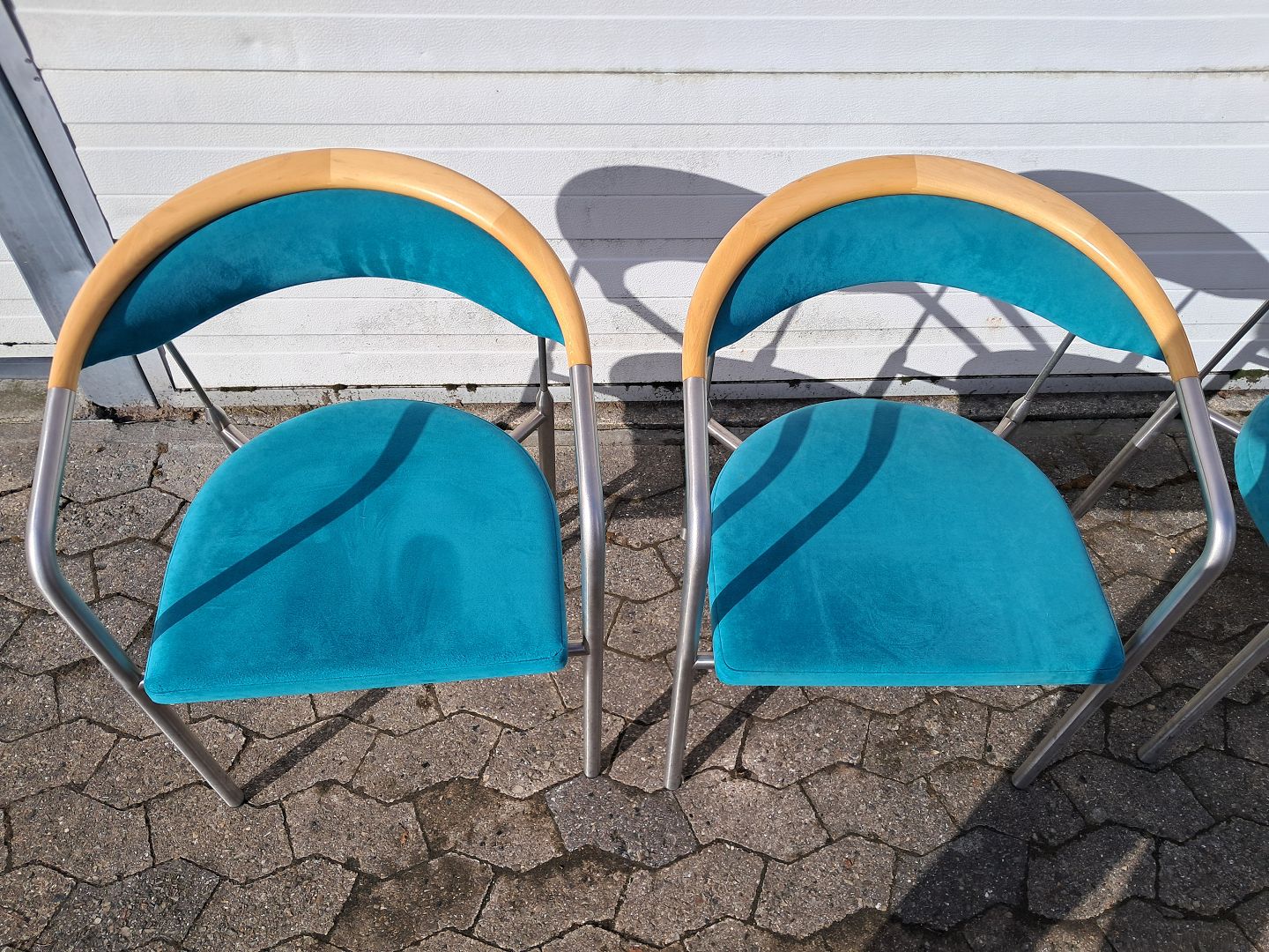 4 Chairman stole af Henrik Tengler i metal med turkis stofbetræk, fra 2000erne.