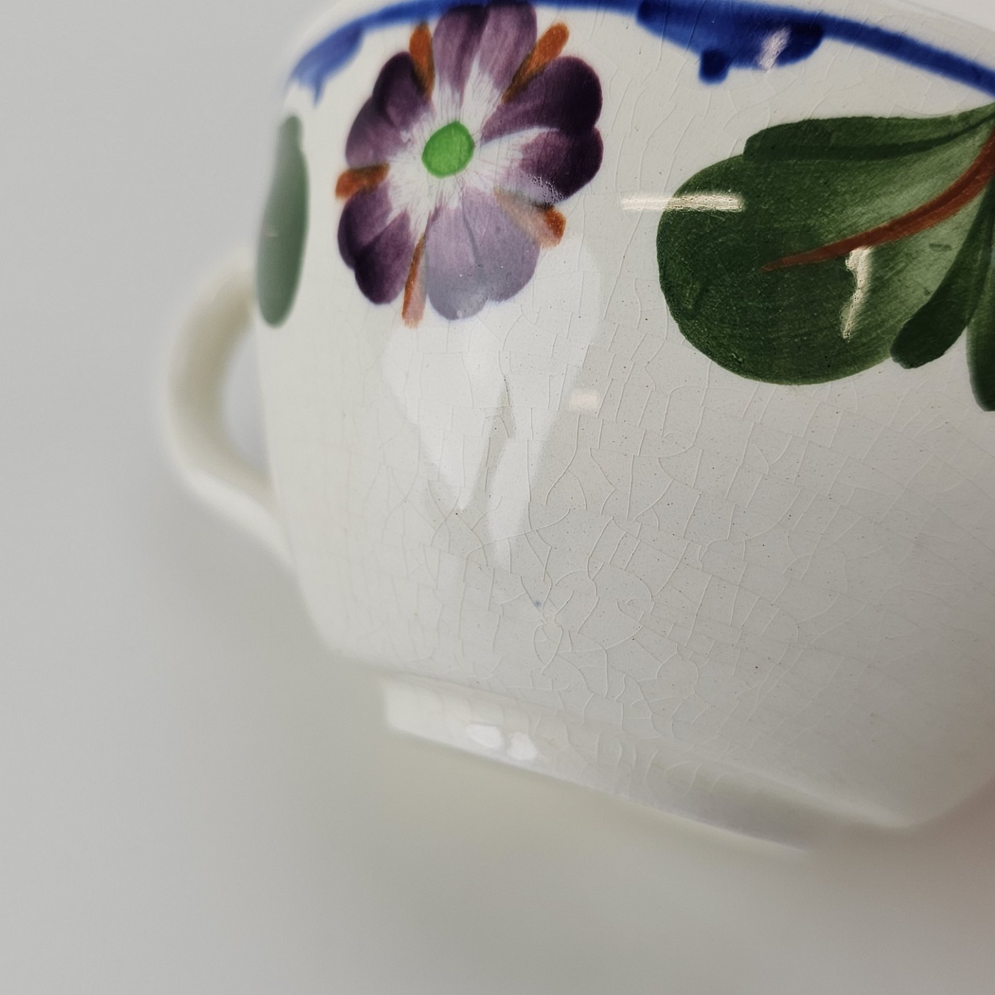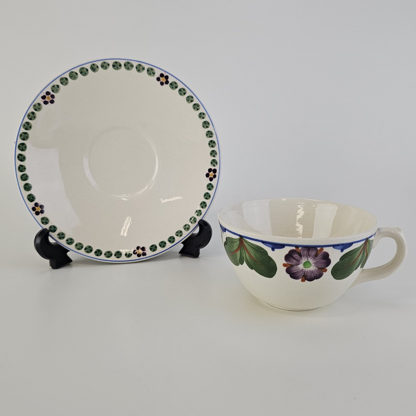 Aurikel er stel i hvid fajance med blomstermotiv