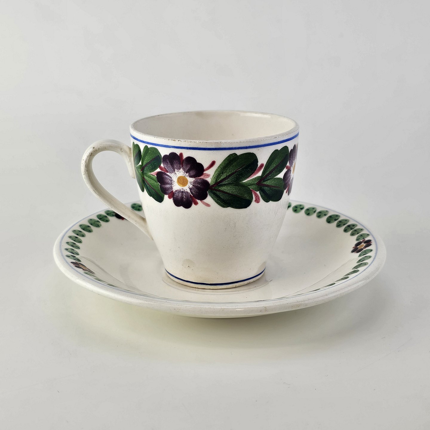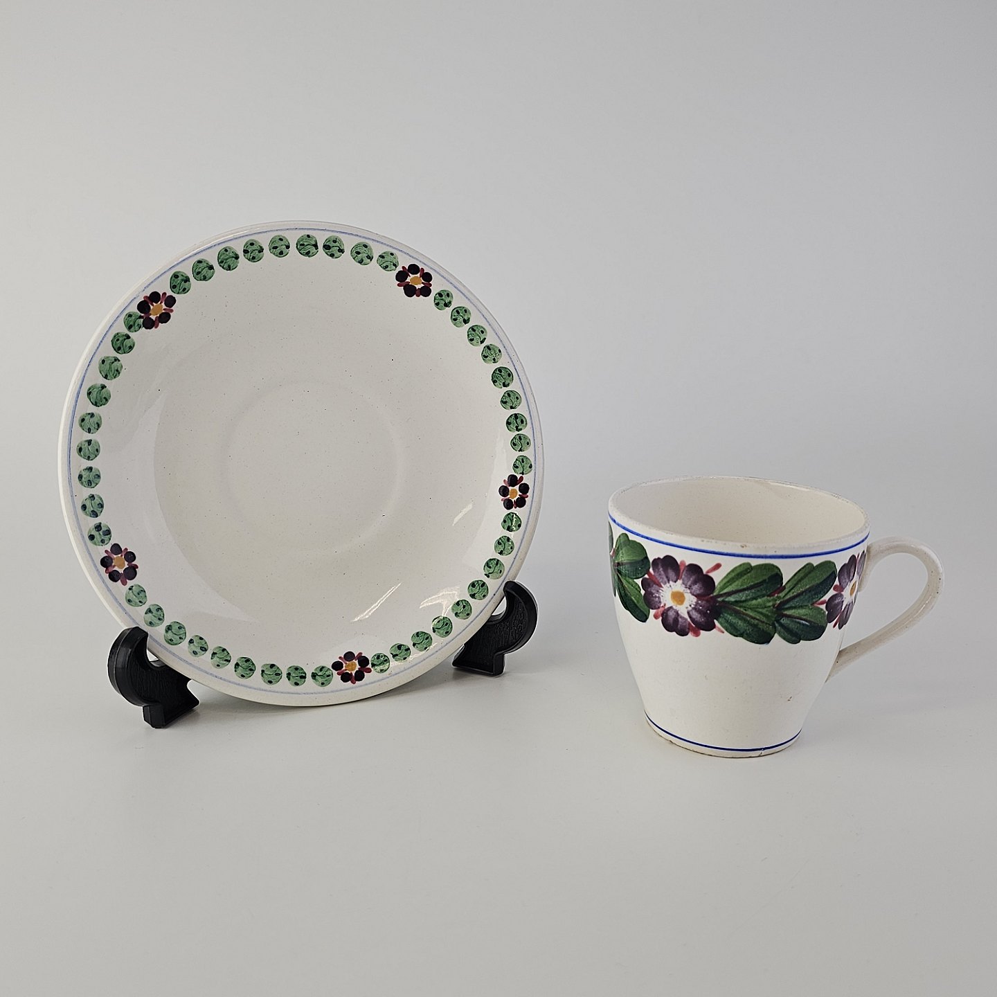 Aurikel er stel i hvid fajance med blomstermotiv