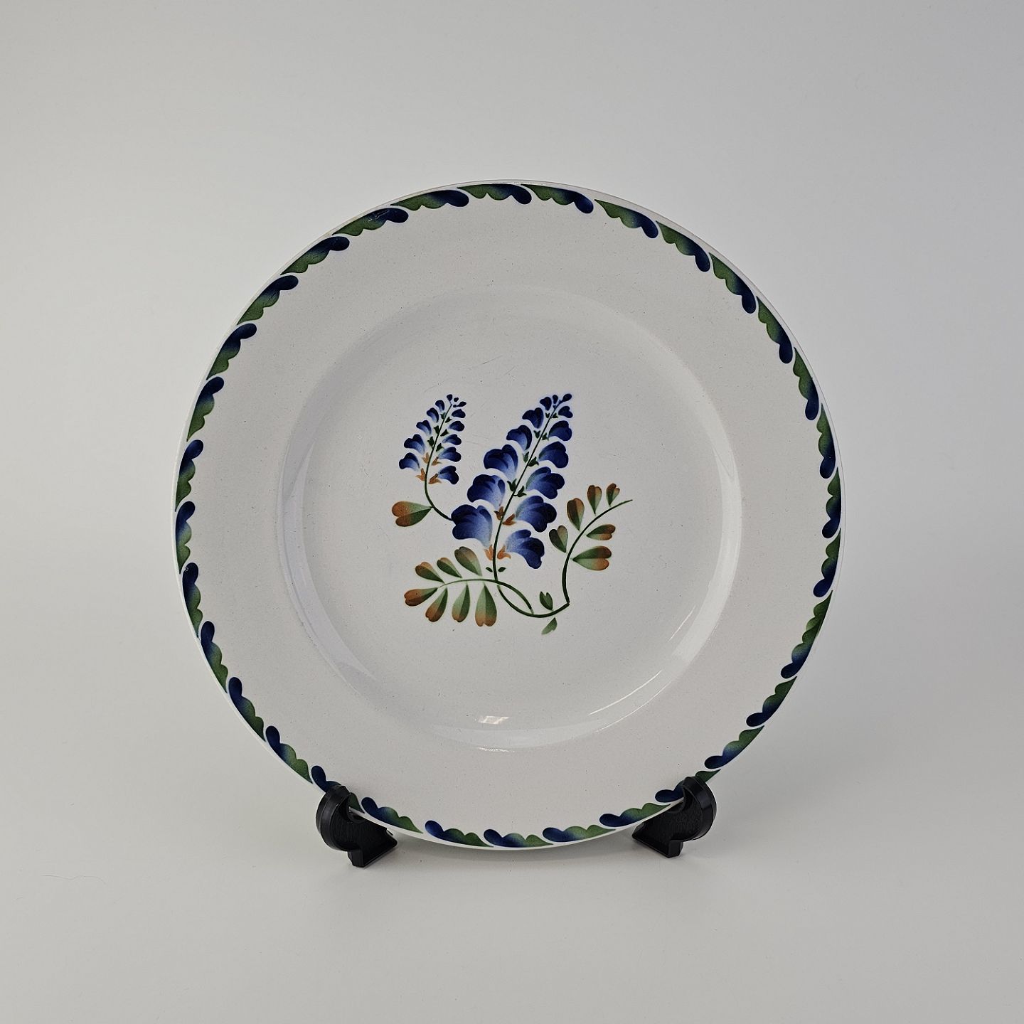 Taasinge er stel i hvid fajance med blomstermotiv og blå dekoration langs kanten, produceret 1931-39