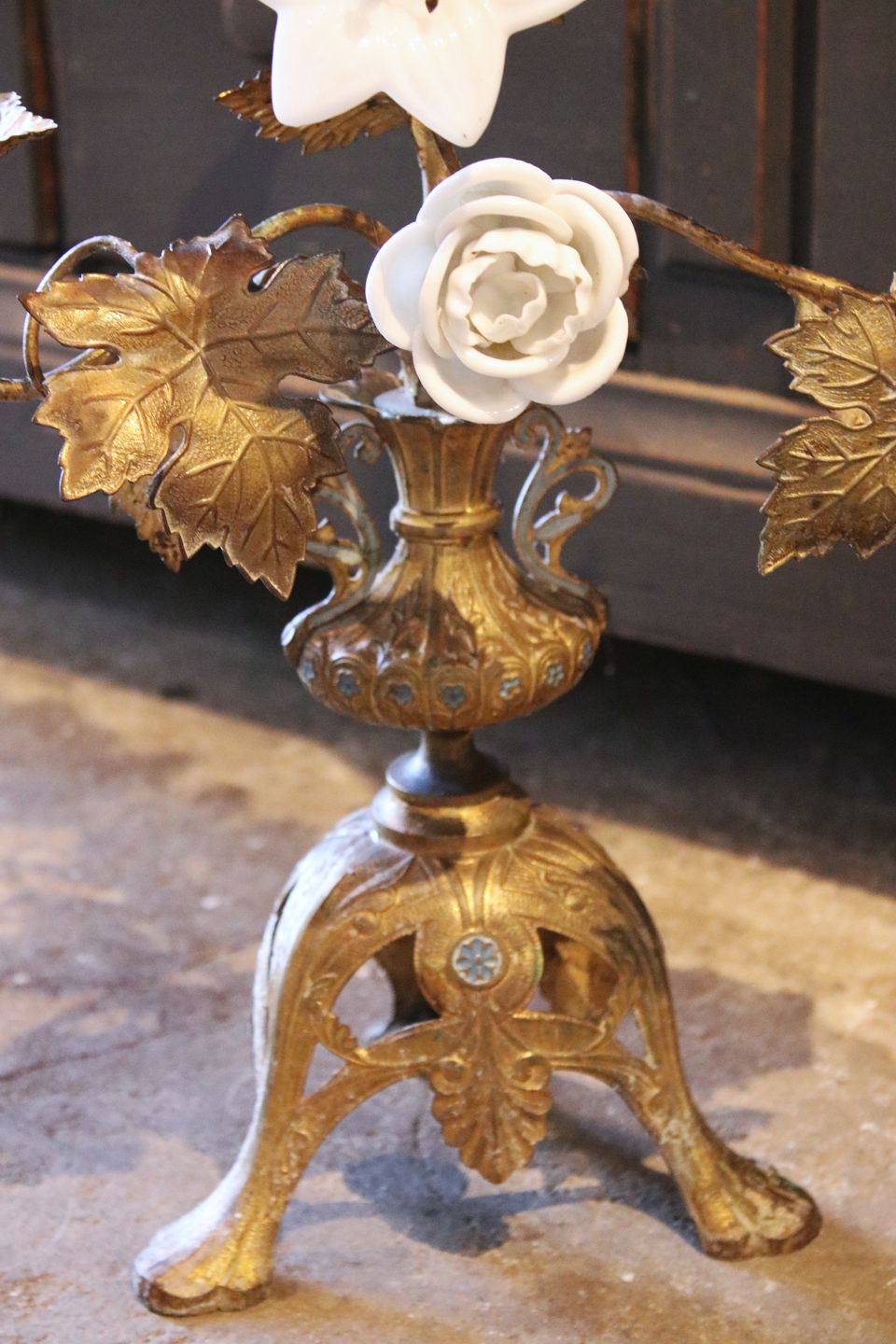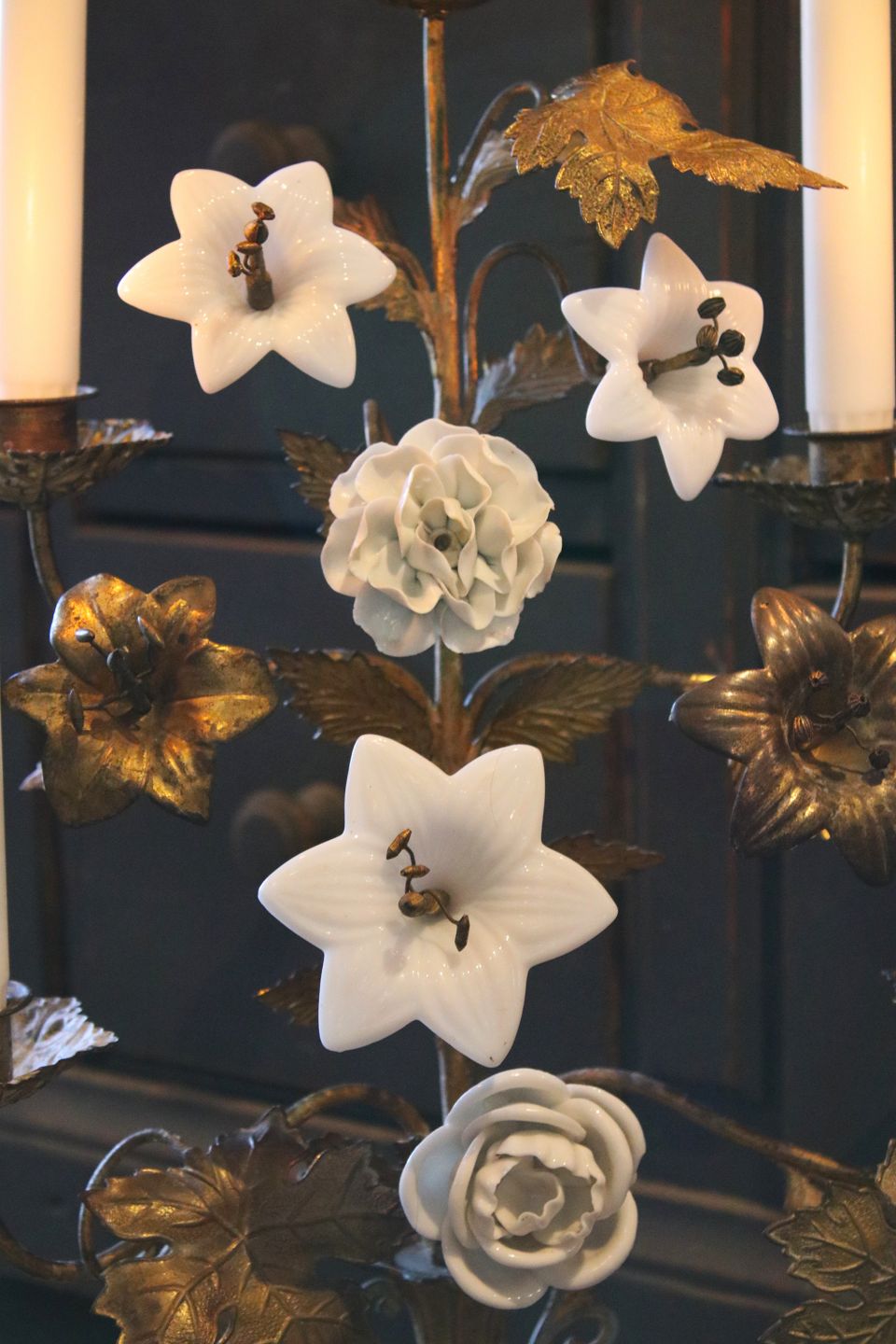Fransk 1800 tals kirkestage dekoreret med 2 gamle hvide porcelæns blomster , 3 hvide opal glas blomst , samt vinblade og 2 bronze blomster.