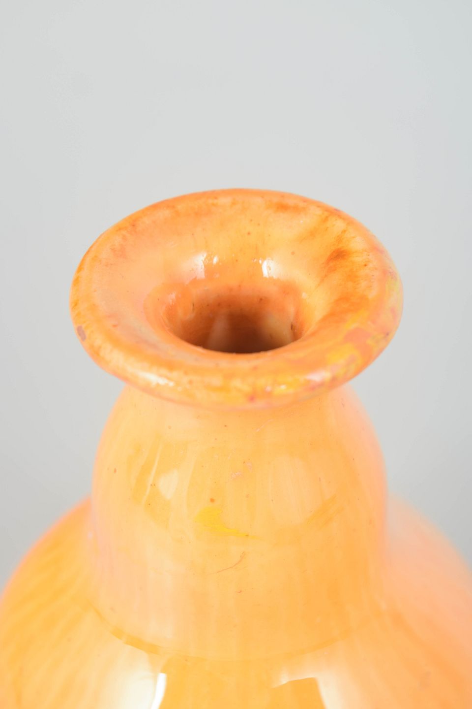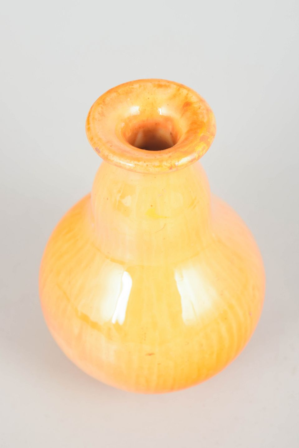 Elegant vase i glaseret lertøj med blød balusterform og let udsvungen rand. Udført i lys gul glasur med varme orange toner og fin vertikal stribning i overfladen, typisk for Hammershøis arbejde med levende glasurer.