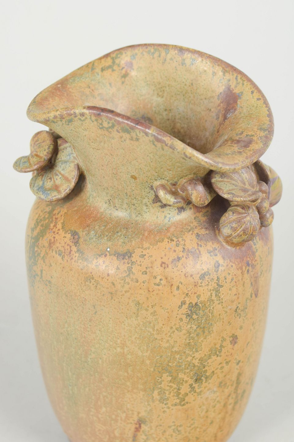 Hånddrejet stentøjsvase med modelnummer 16, udført i organisk form med reliefdekoration af blade ved halsen og dækket af levende glasur i varme jordfarver med nuancerede overgange.