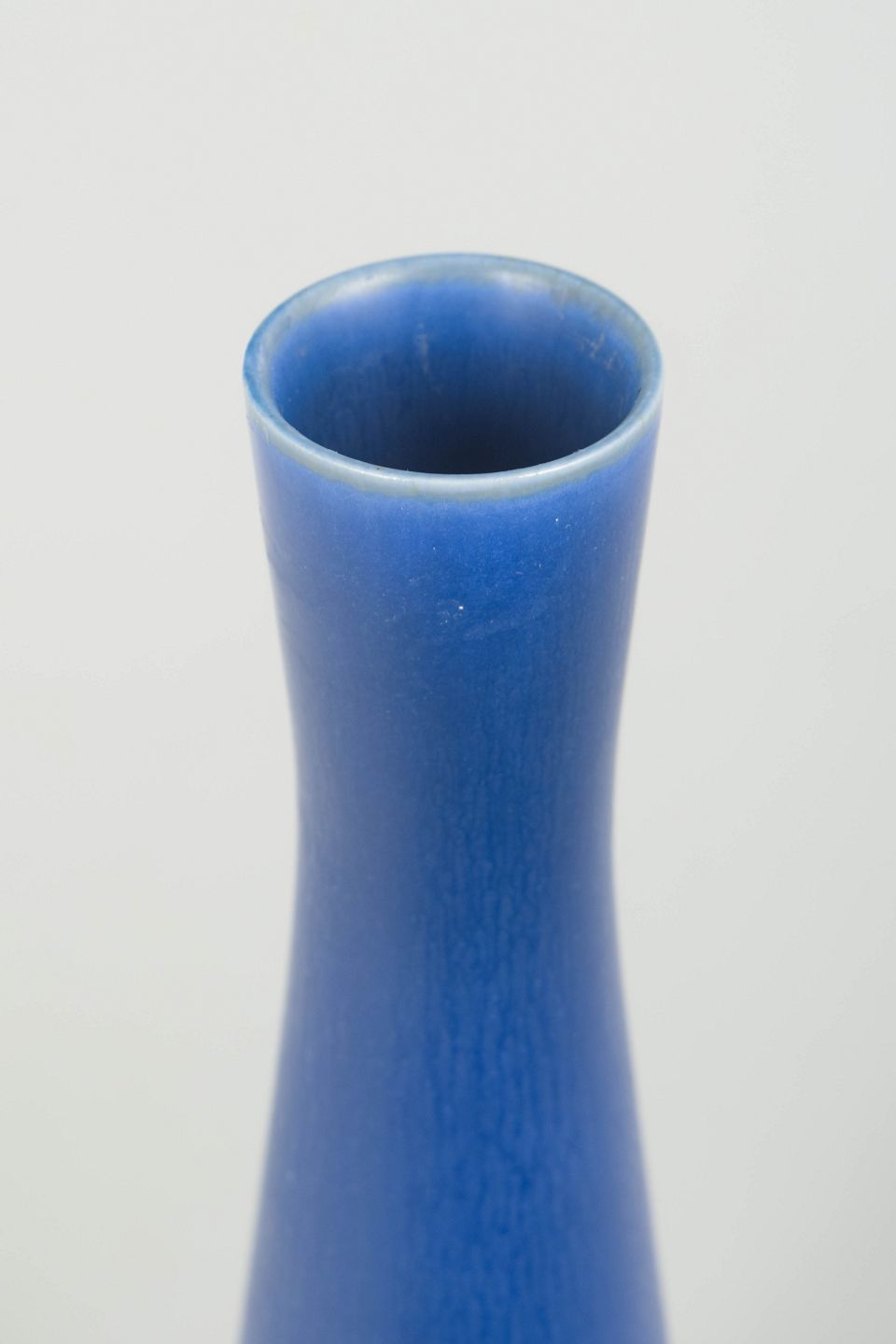 Slank og elegant formet vase i drejet stentøj med karakteristisk blå harepelsglasur, signeret FB under bunden.