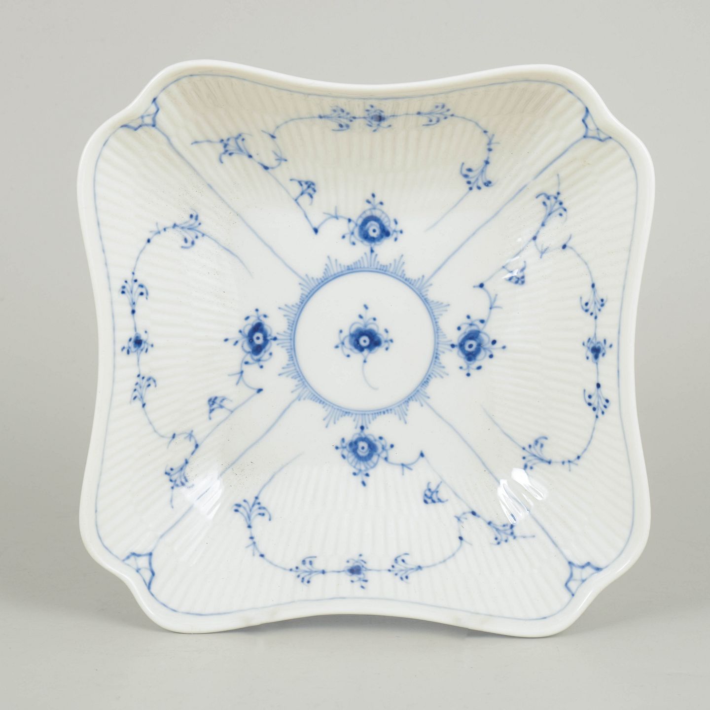 Firkantet fad i porcelæn dekoreret i underglasur blå med klassisk musselmalet riflet mønster. Model 1/26, 1. sortering, dateret 1966.