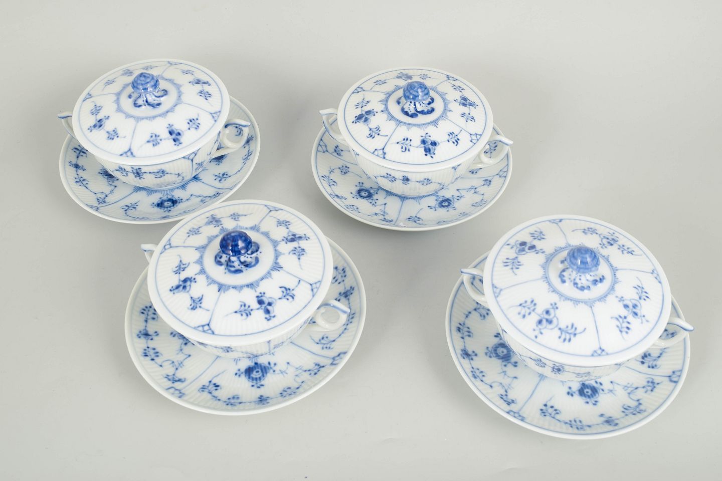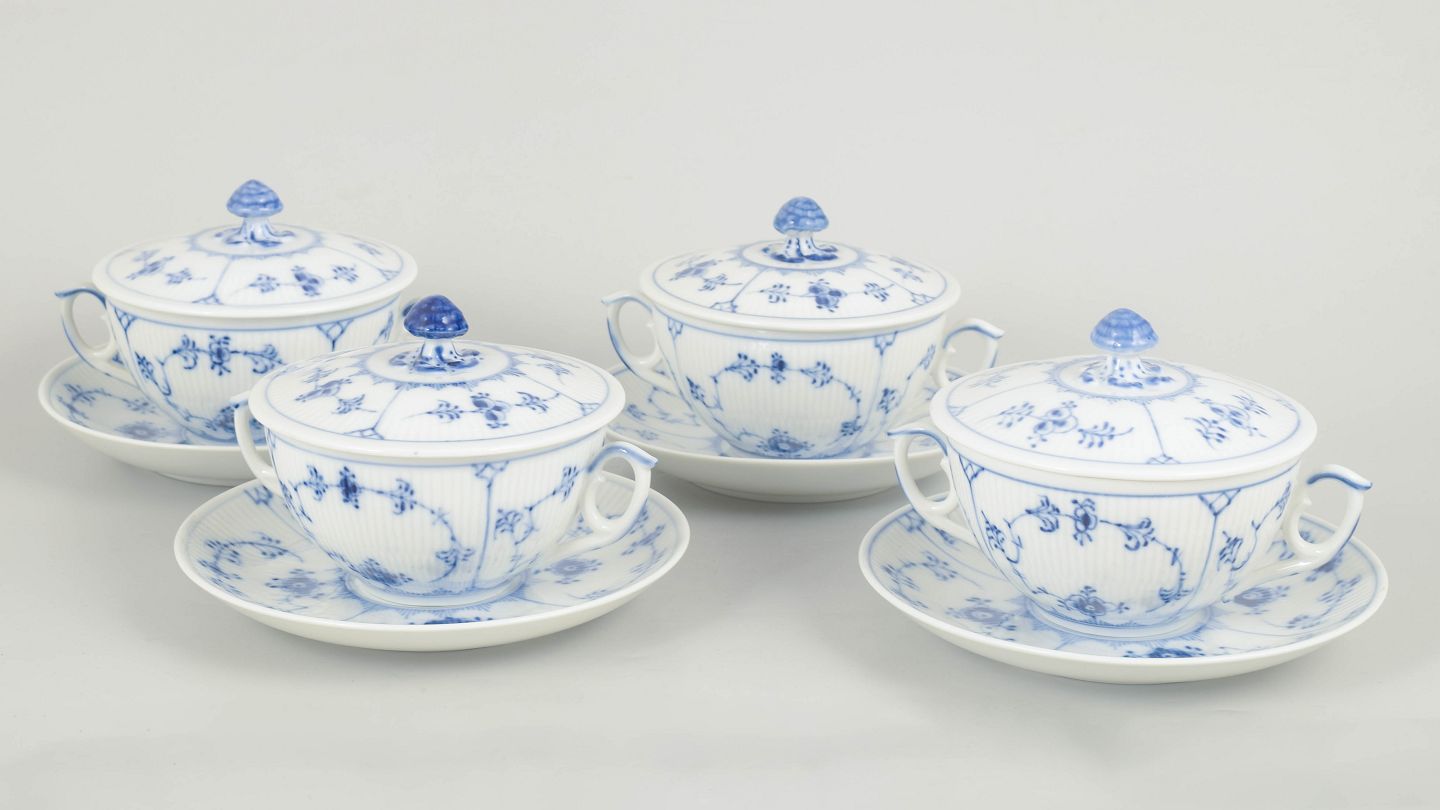 Royal Copenhagen, musselmalet riflet sæt af fire bouillonkopper med underkopper.