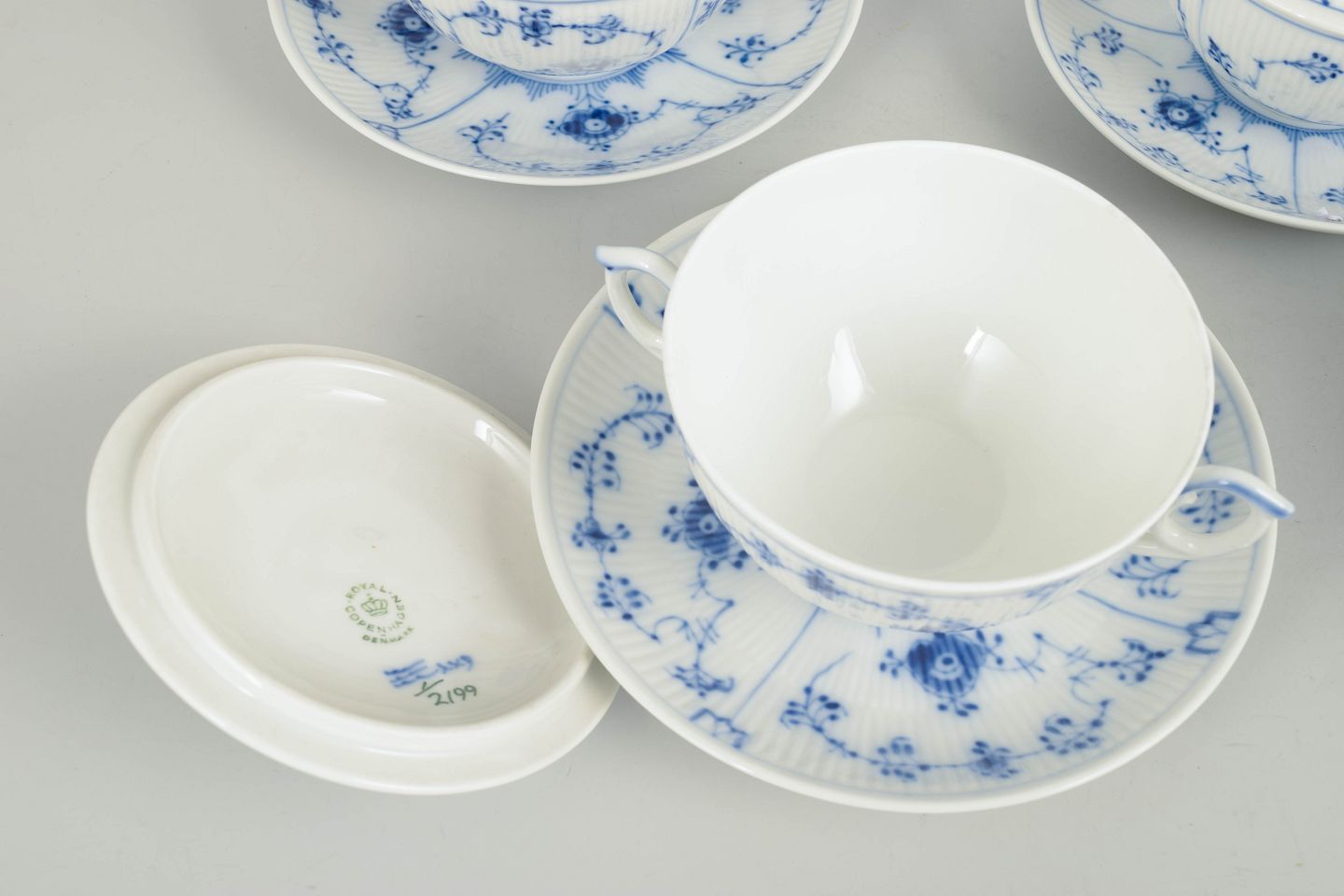 Sæt af fire bouillonkopper i porcelæn med matchende underkopper, dekoreret i underglasur blå med klassisk musselmalet riflet mønster. Model 1/2199, 1. sortering, dateret 1966.