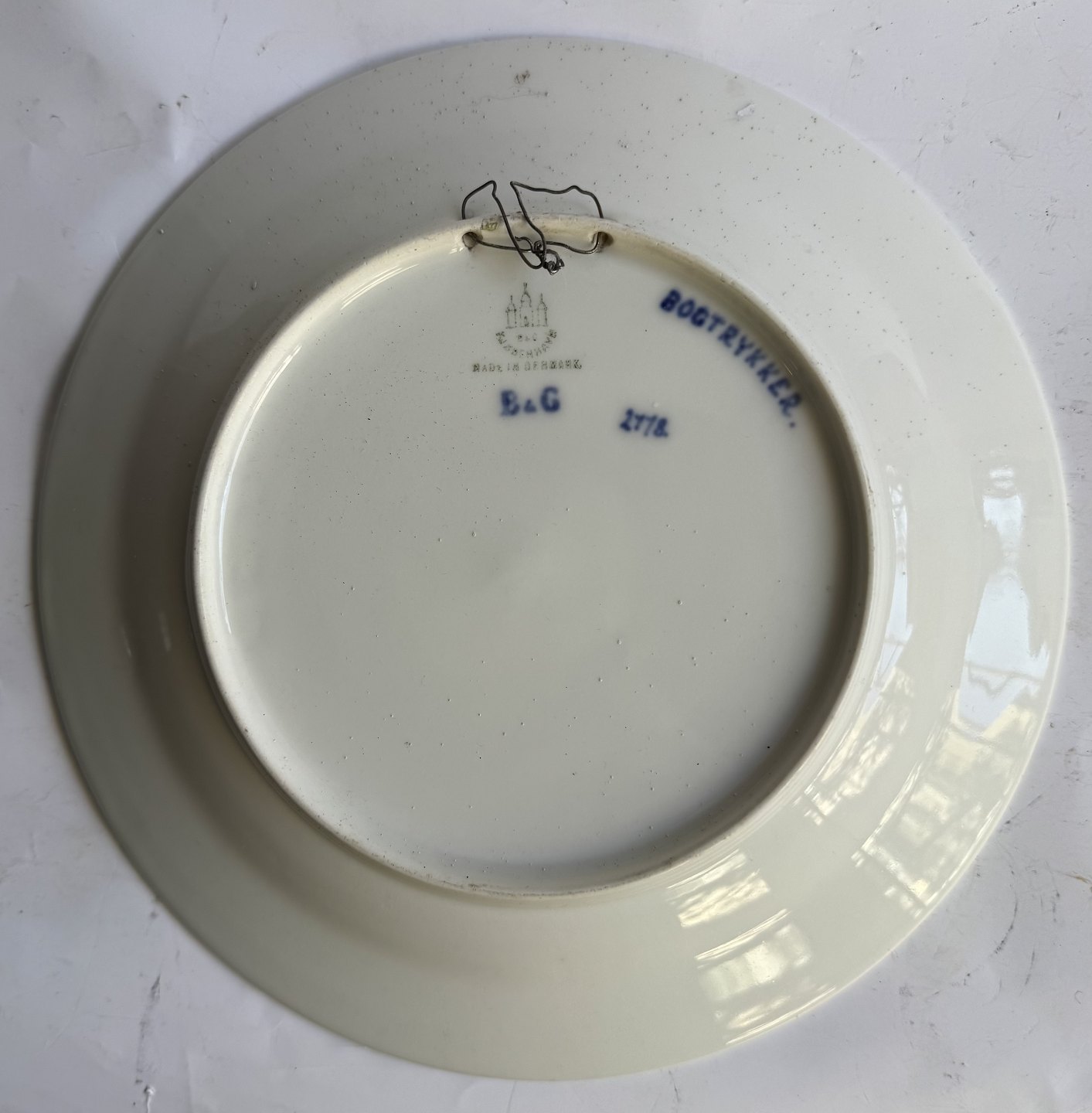 Bing & Grøndahl porcelæns platte; Bogtrykkernes segl i København. Designet af Fanny Garde. Har lidt "støv" på bagsiden øverst (se billeder). Ellers i fin stand. 1. sortering. Ingen skader eller reparationer. Ø. 24 cm.