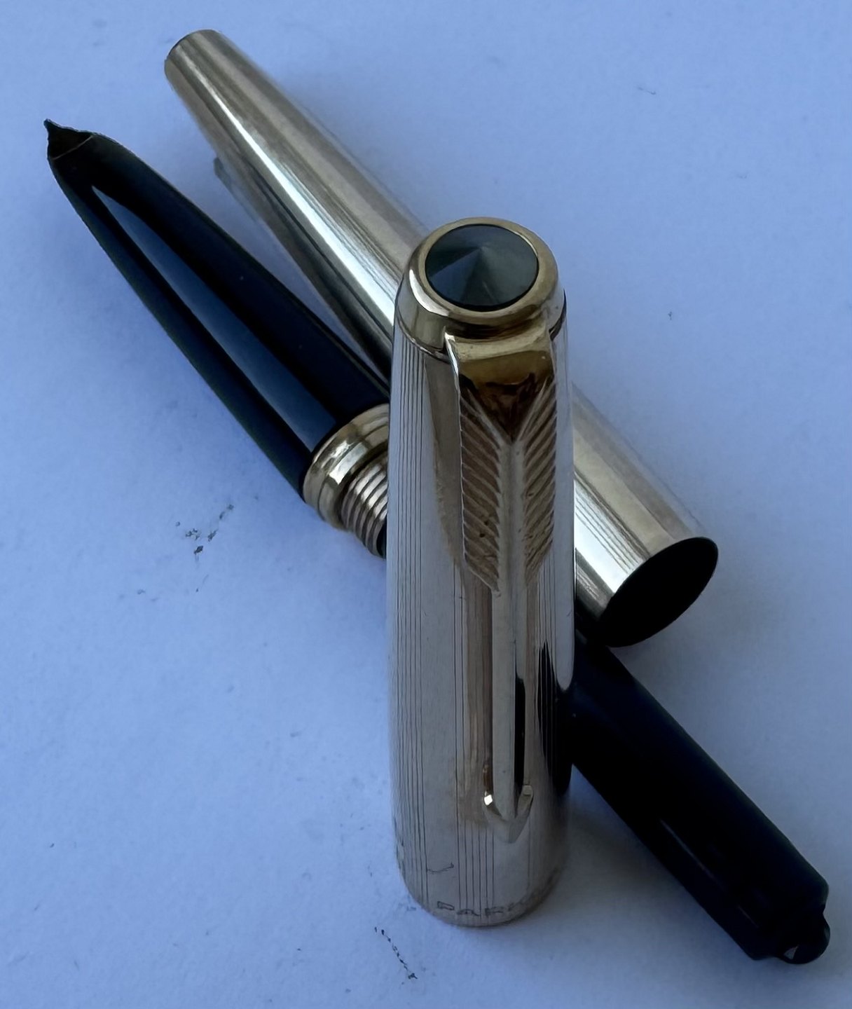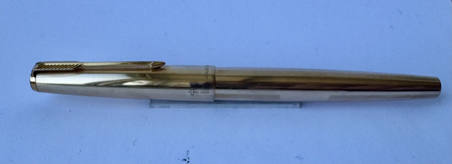 Guld-double Parker 61 fyldepen. Klar til at blive brugt. Fremstår i god og funktionsdygtig stand. Brugt meget lidt. Ingen særlige brugsspor. L. 13,3 cm