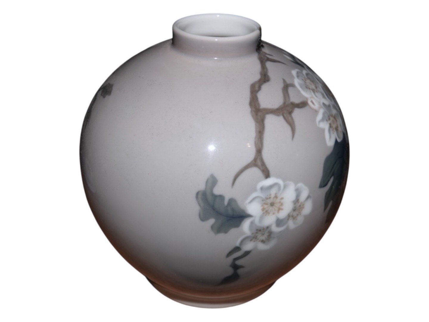 Bing & Grøndahl kuglerund vase med hvide blomstergrene og sommerfugl.