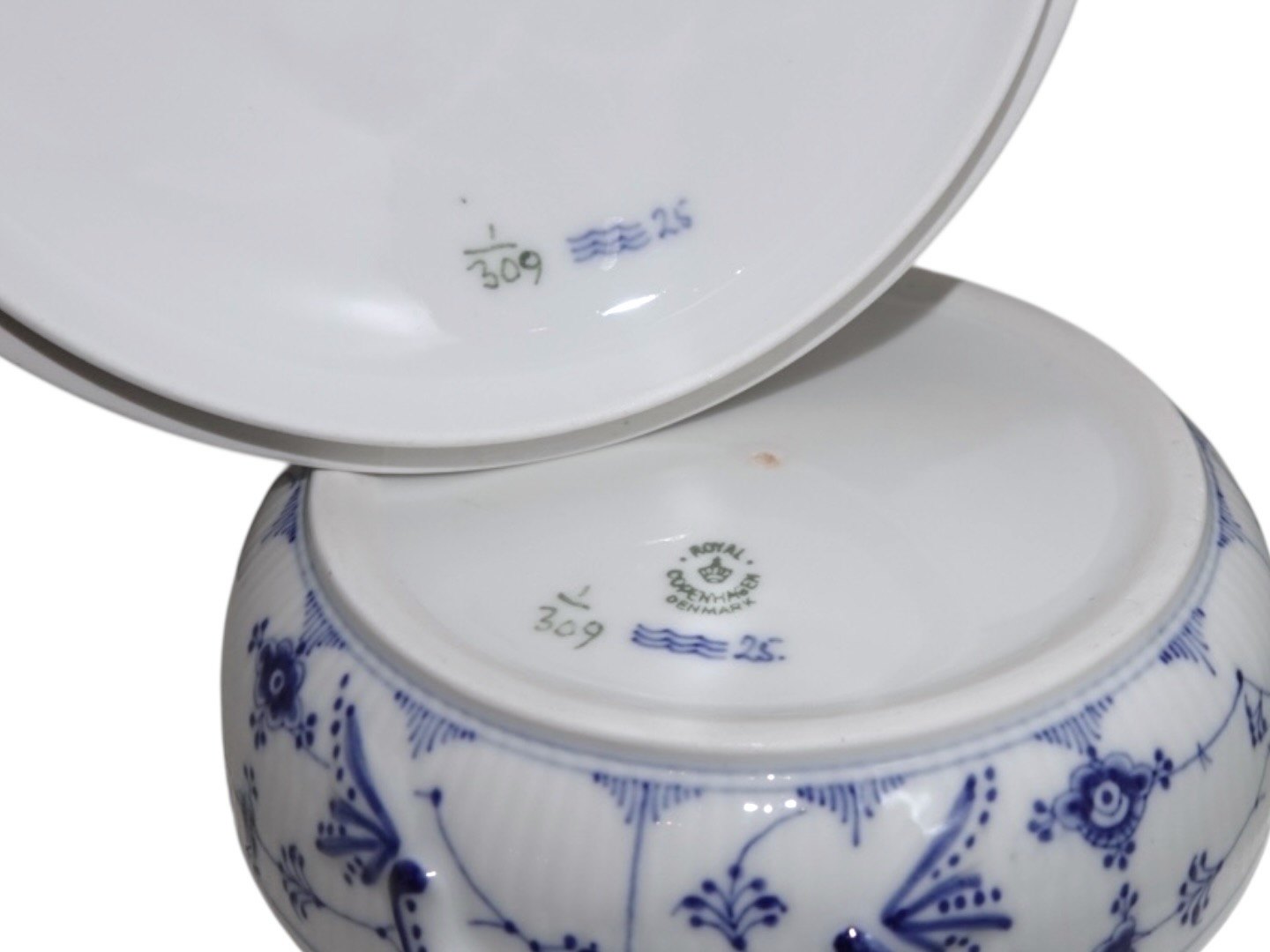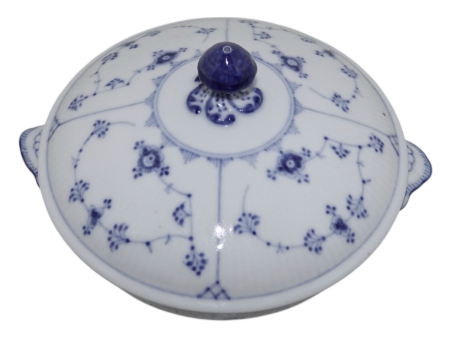 Royal Copenhagen Musselmalet Riflet, sjældent lille rundt lågfad (lille terrin).