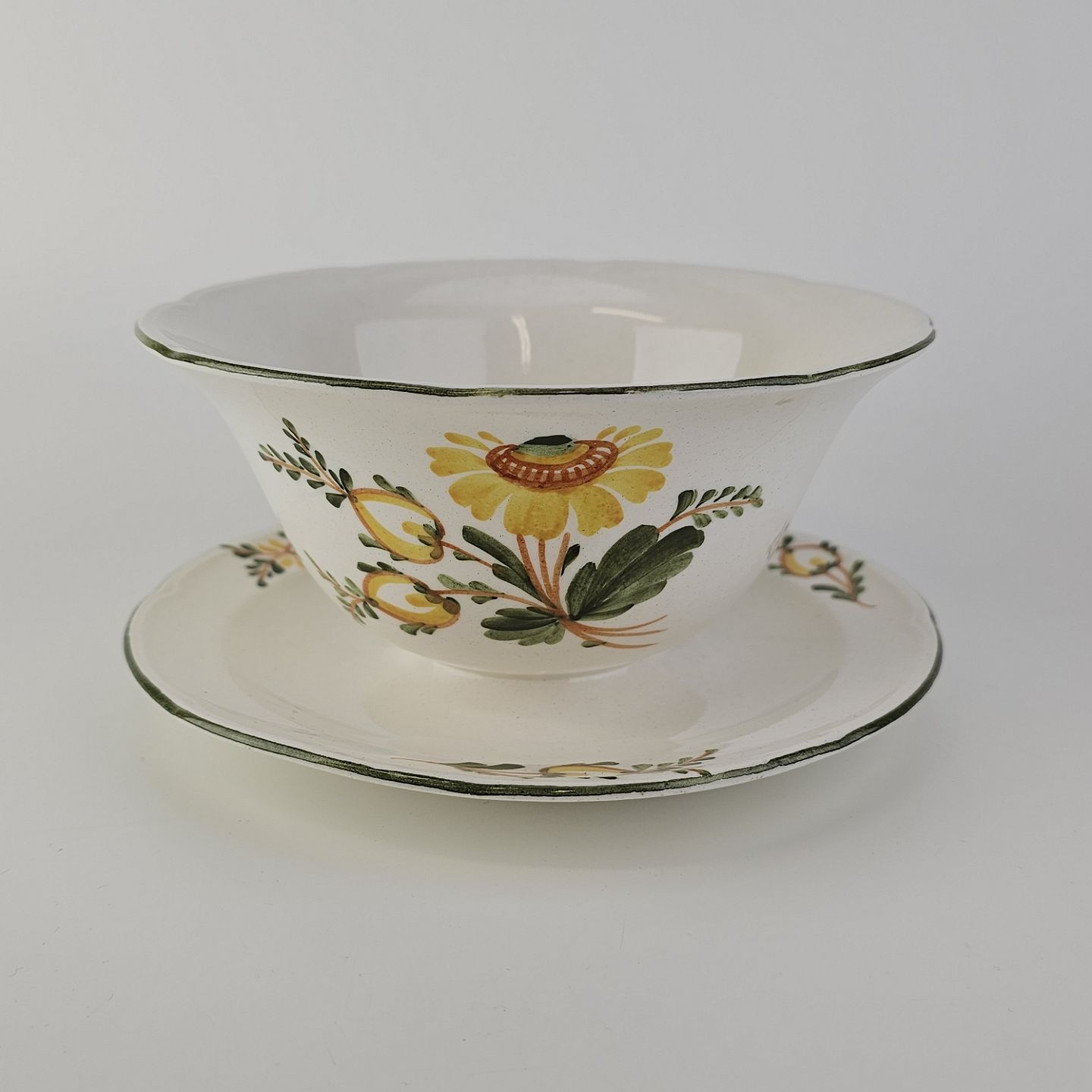 Hvidt fajancestel i stelform Feston/Alma med motiv af gule blomster og grønne blade.