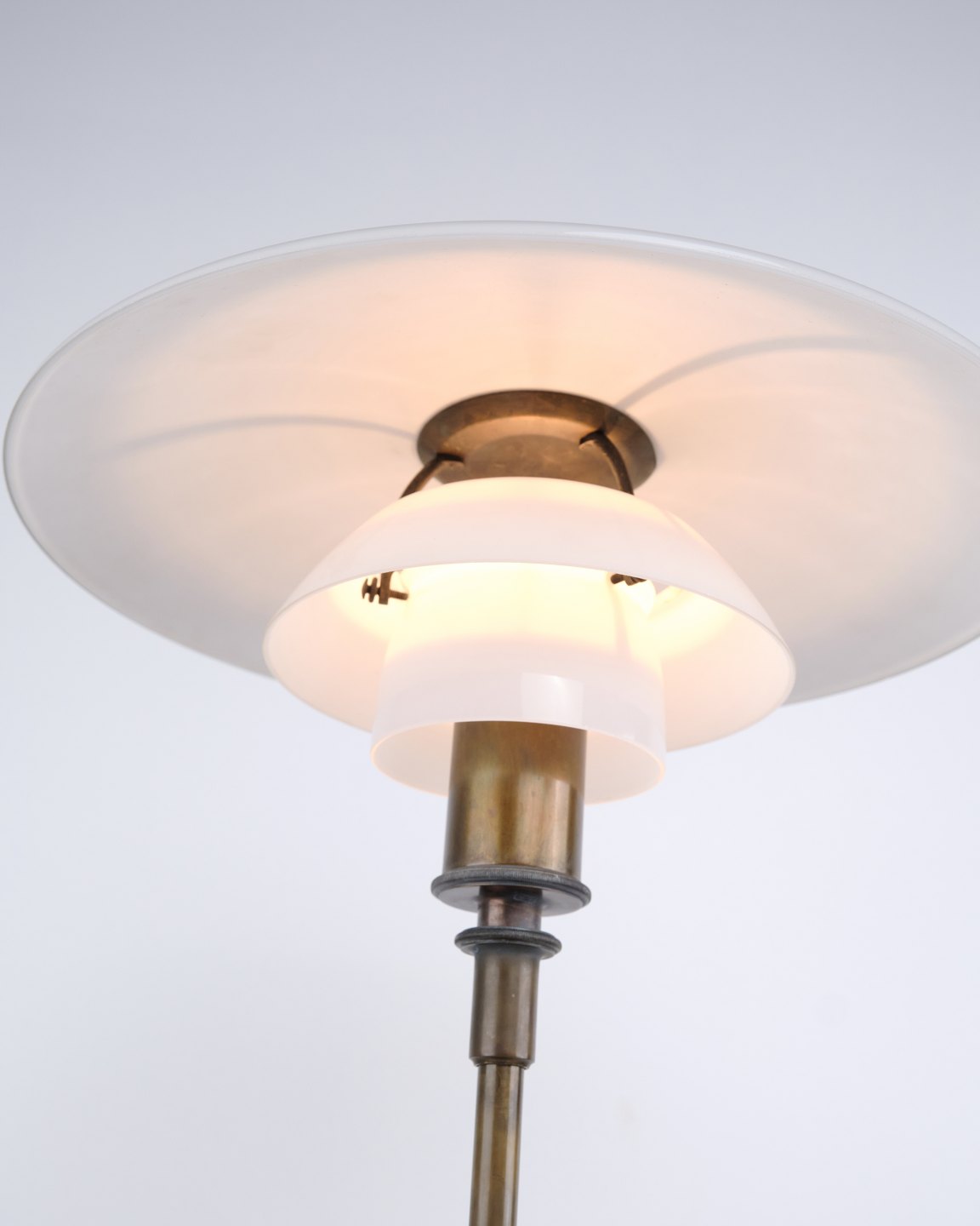 PH 4/3 bordlampe designet af Poul Henningsen og produceret af Louis Poulsen i 1930’erne. Lampen er udført i bruneret messing med skærme i hvidt opalglas, som giver en behagelig og diffust fordelt belysning.