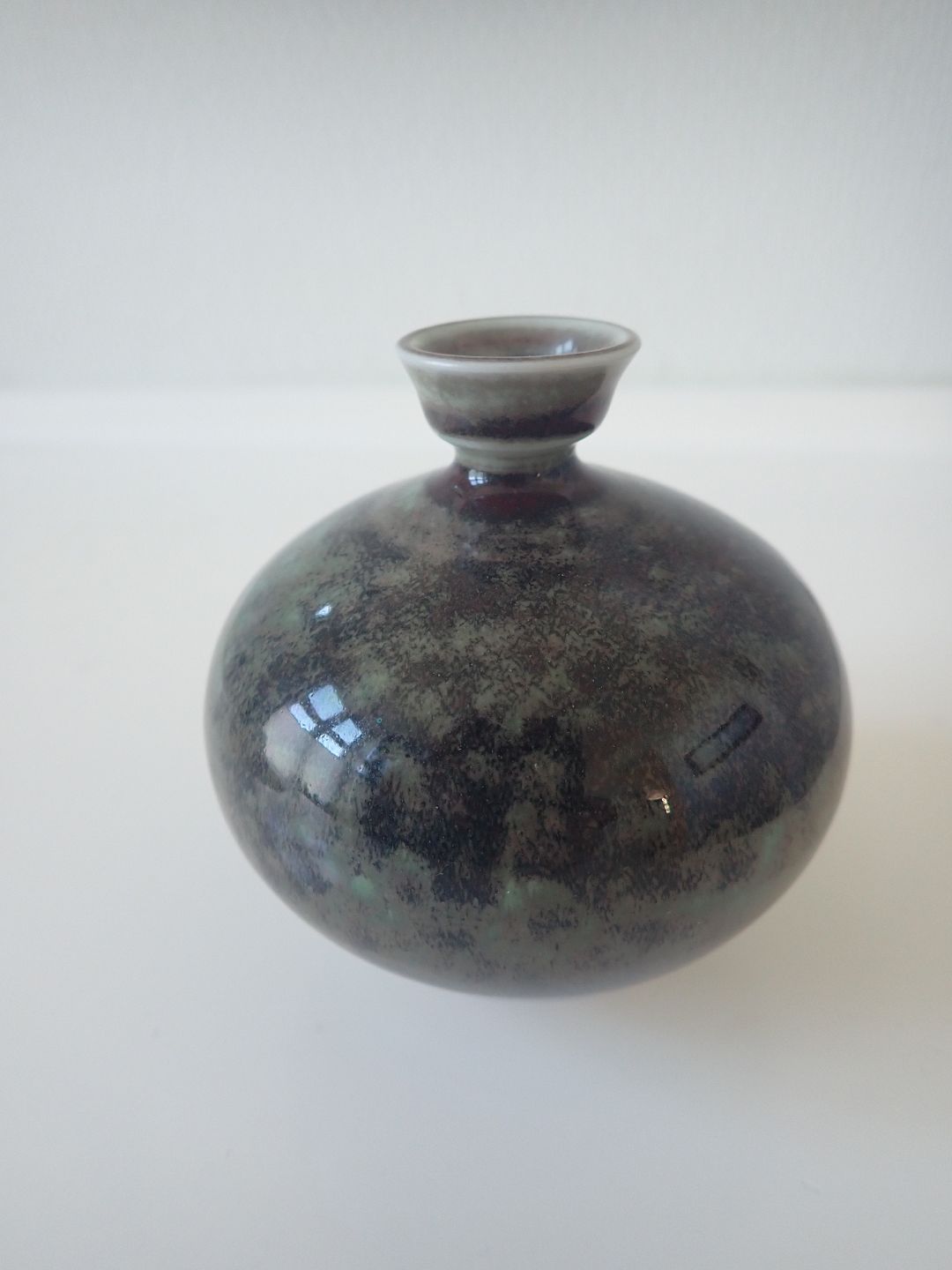 Berndt Friberg (1899 - 1981 )- Lille, buttet vase i stentøj med lille krave med blank grøn/brun/sort spættet glasur. Stemblet Friberg 77, Studio-hånd fra Gustavsberg. Højde: 8,7 cm. Bredde: ca. 7,5 cm. I fin stand.