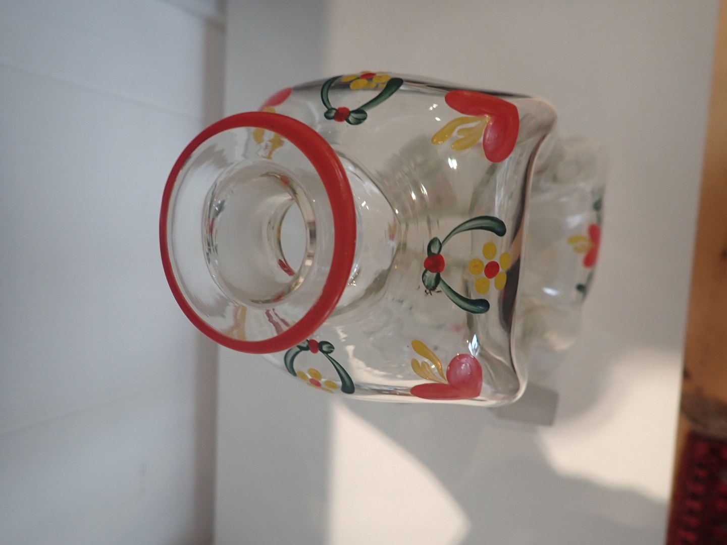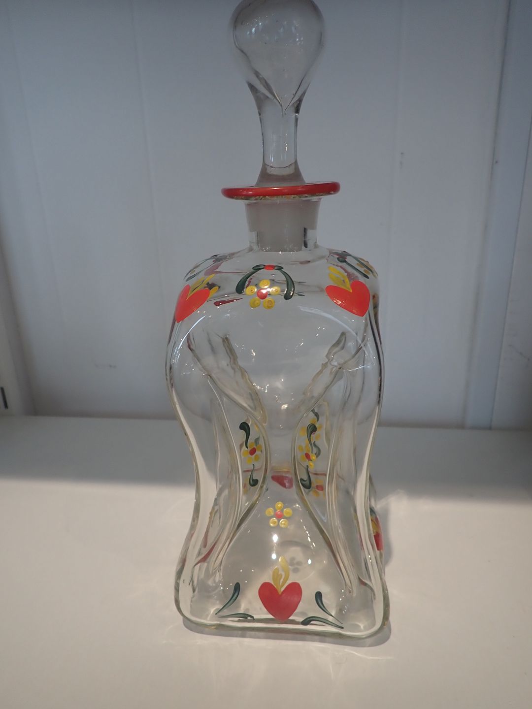 Emaljebemalet Klukflaske (hjerter og blomster) fra Holmegaard designet af Jacob A. Bang i 1937 - 1957 - i meget fin stand - sælges alene for 4oo kr. Højde: 29 cm. I fin stand