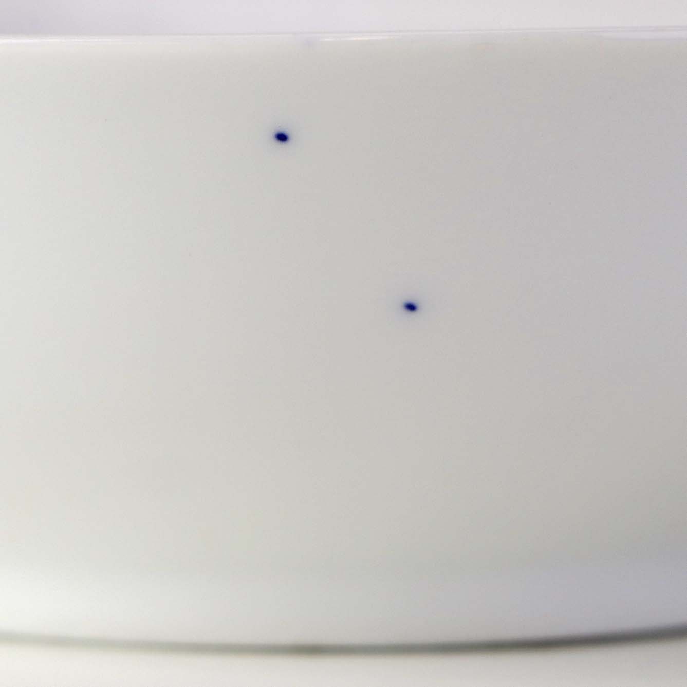 Fremstår med to prikker under glasuren samt ujævn glasur.