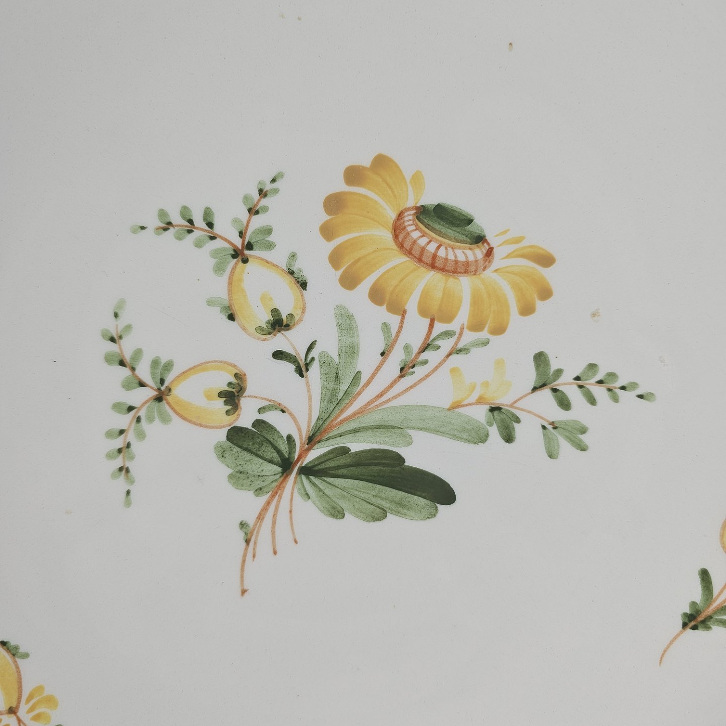 Hvidt fajancestel i stelform Feston/Alma med motiv af gule blomster og grønne blade.