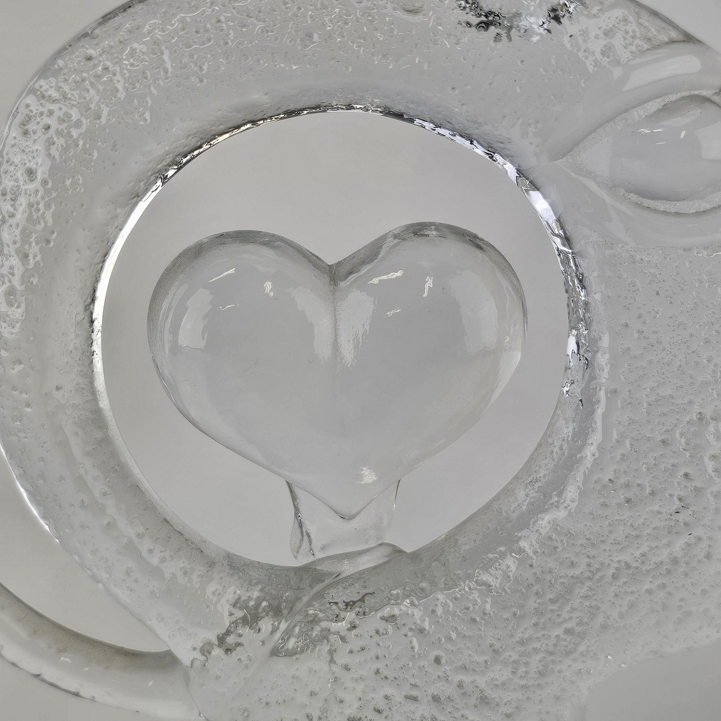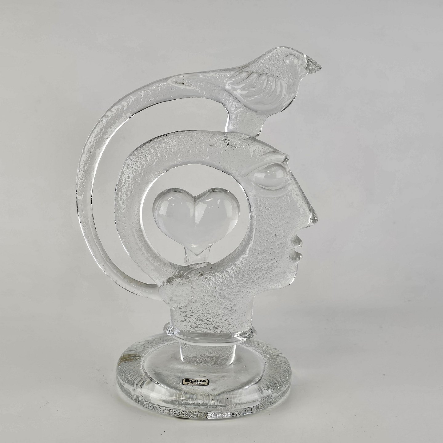 Skulptur i glas med motiv af et menneske i profil, en fugl og et hjerte