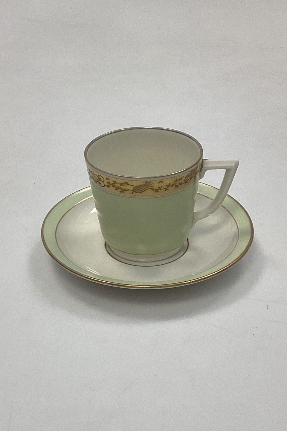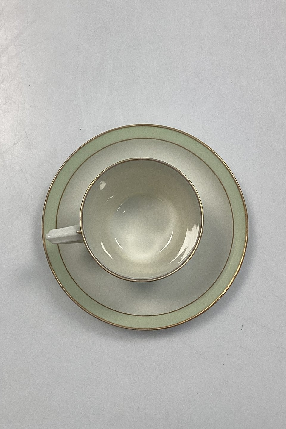 Pistaciegrøn og cremefarvet stel med guldkant designet af Thorkild Olsen i 1930'erne