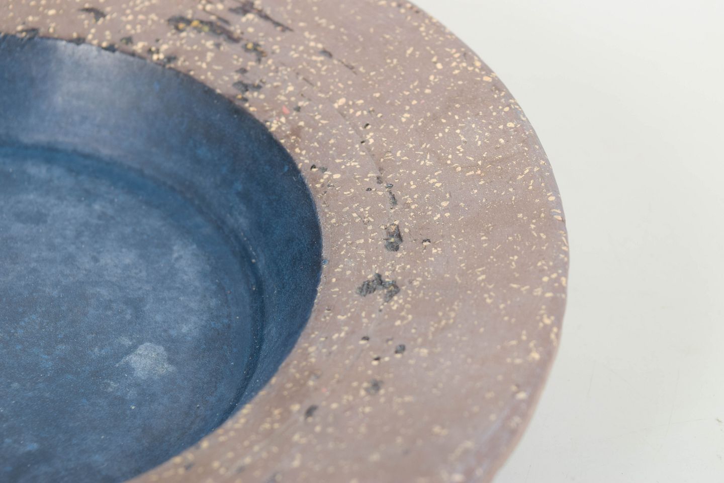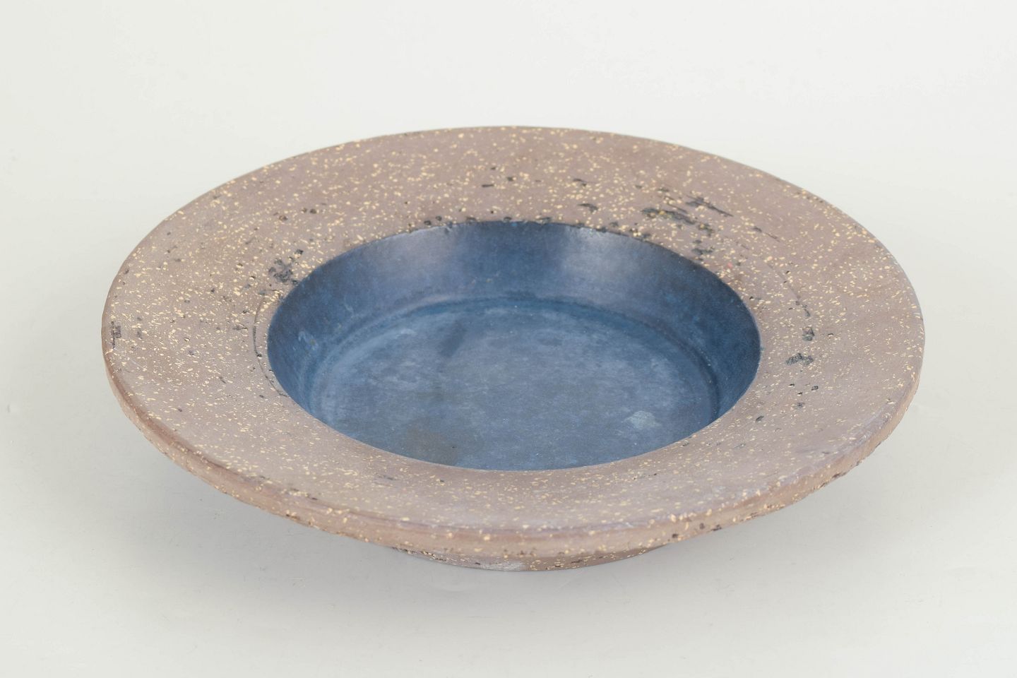 Dekorativt rundt fad i stentøj med mat glasur i blå og sandfarvede toner samt spraglet overflade. Model 4070B.