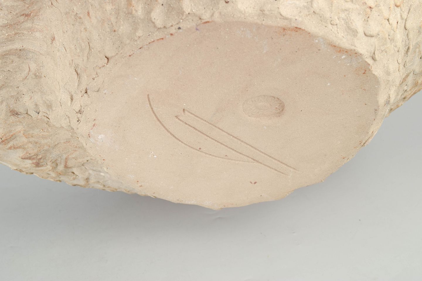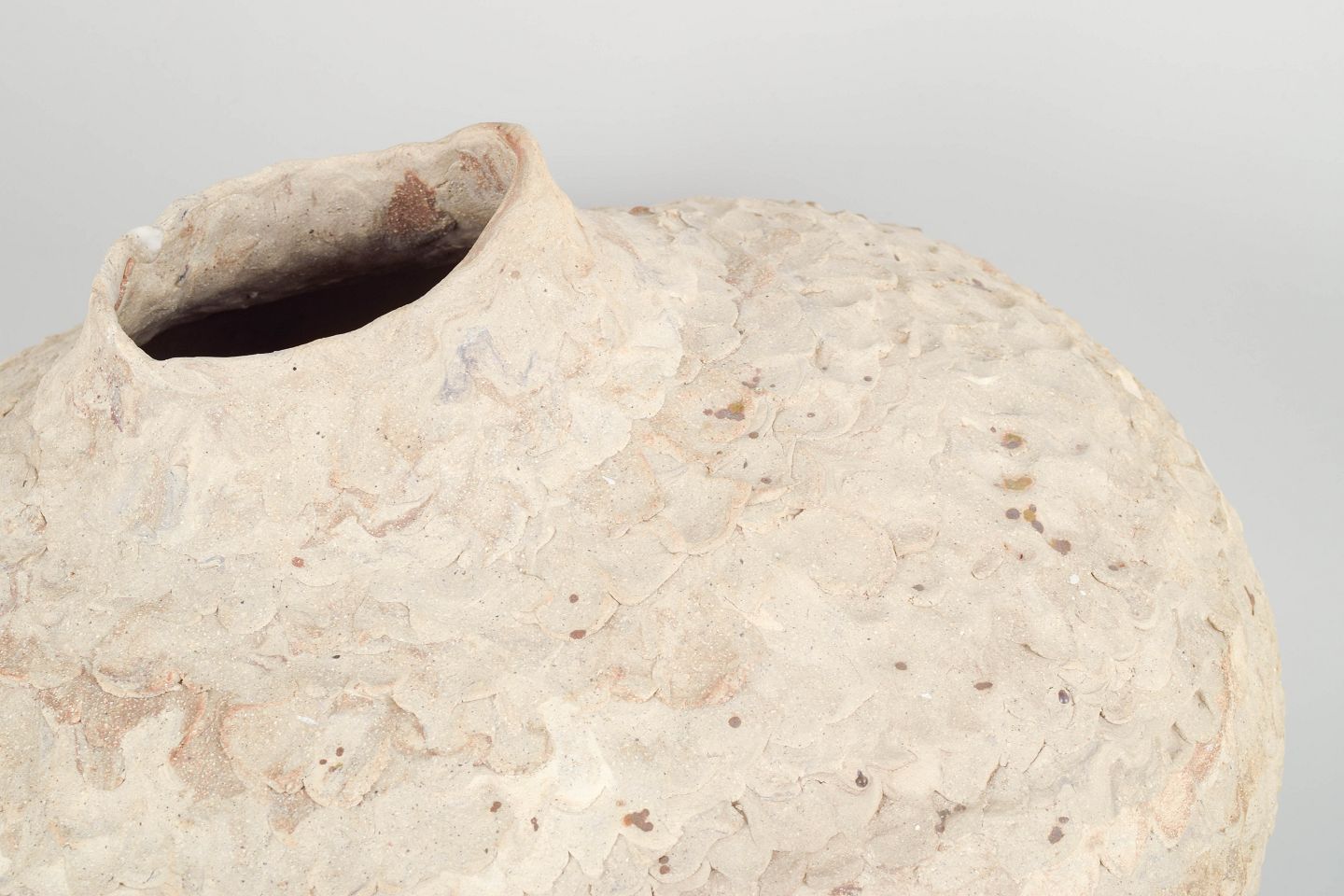 Stor unika rund stentøjsvase. Værket er uglaseret i kunstnerens signaturstil med blandede lertyper. Leret er genbrugsler, der er sammensat med tusindvis af kunstnerens tryk med fingrene, dette giver værket et taktilt, organisk og blødt udtryk. Kan ikke holde væske.