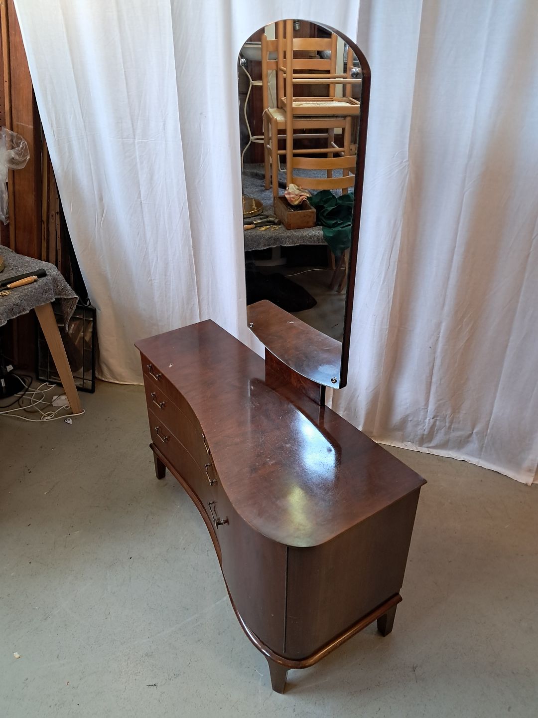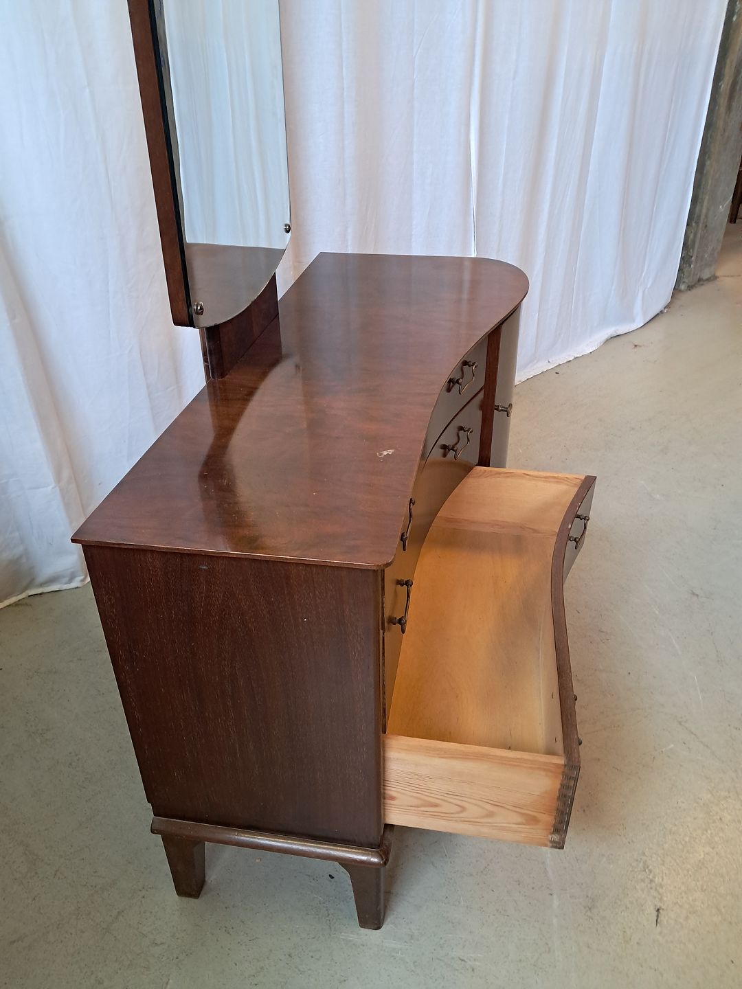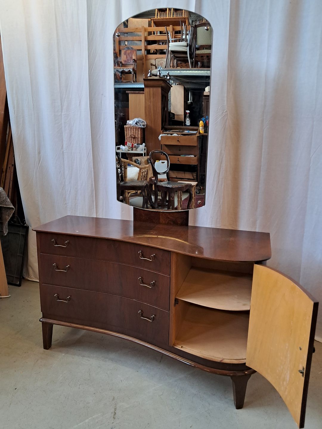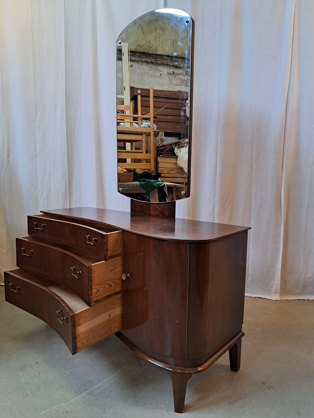 Skuffemøbel med spejl i fineret nødetræ, fra 1950erne.