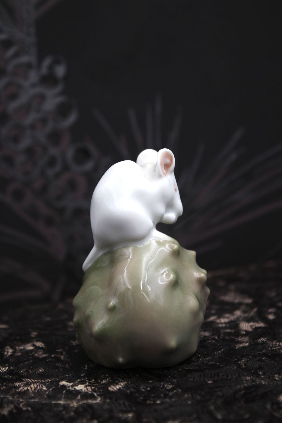 Lille hvid mus siddende på en kastanje , fin lille porcelænsfigur fra Royal Copenhagen...