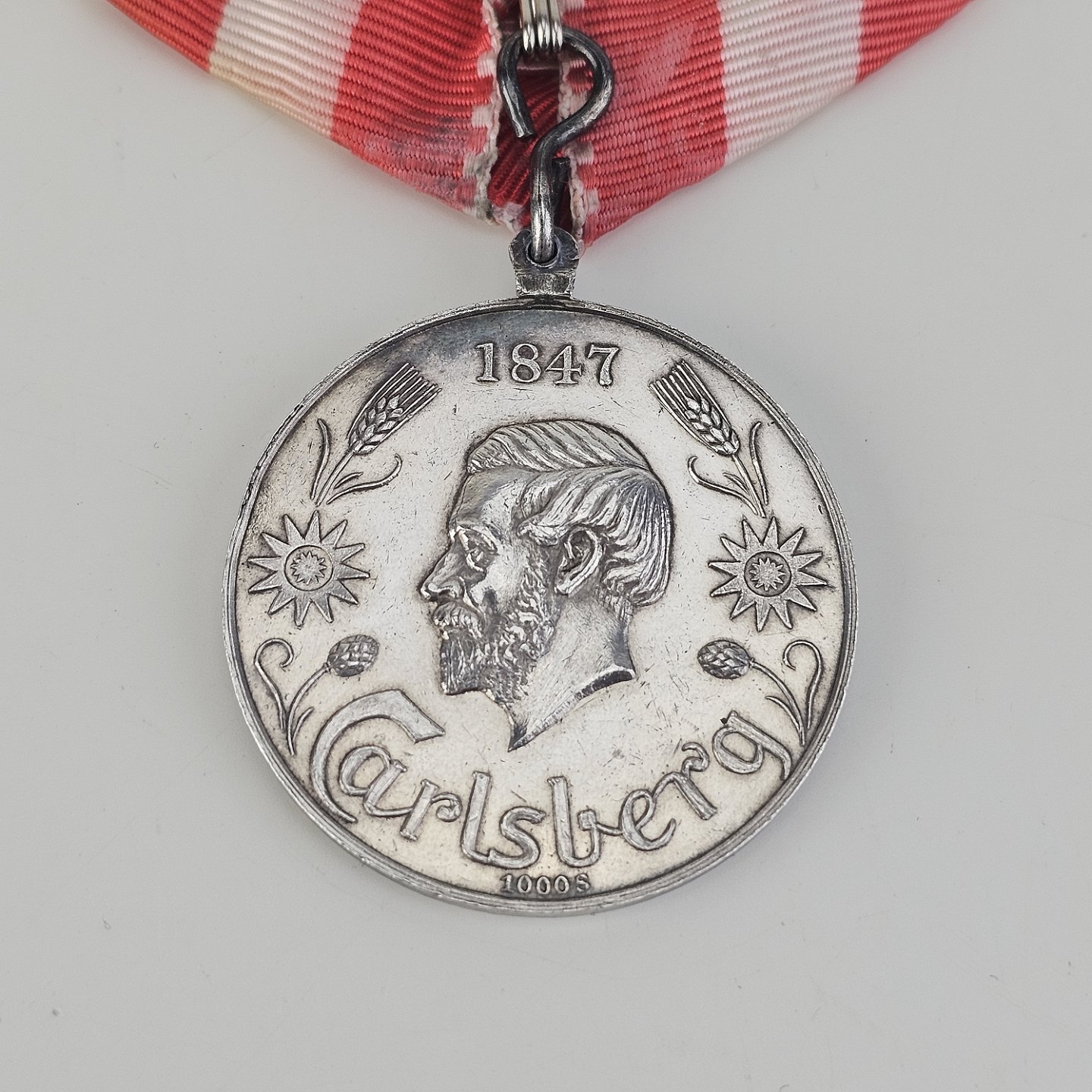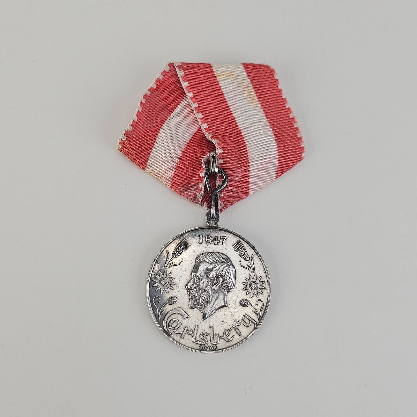 Carlsberg jubilæumsmedalje i sølv med Carlsberg 1847 graveret på den ene side og "Laboremus pro patina" 1881 på den anden