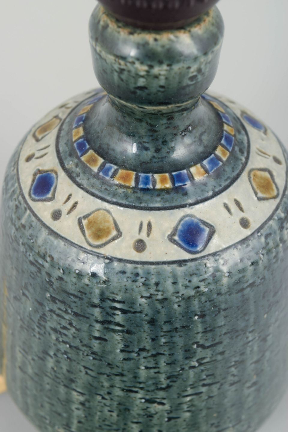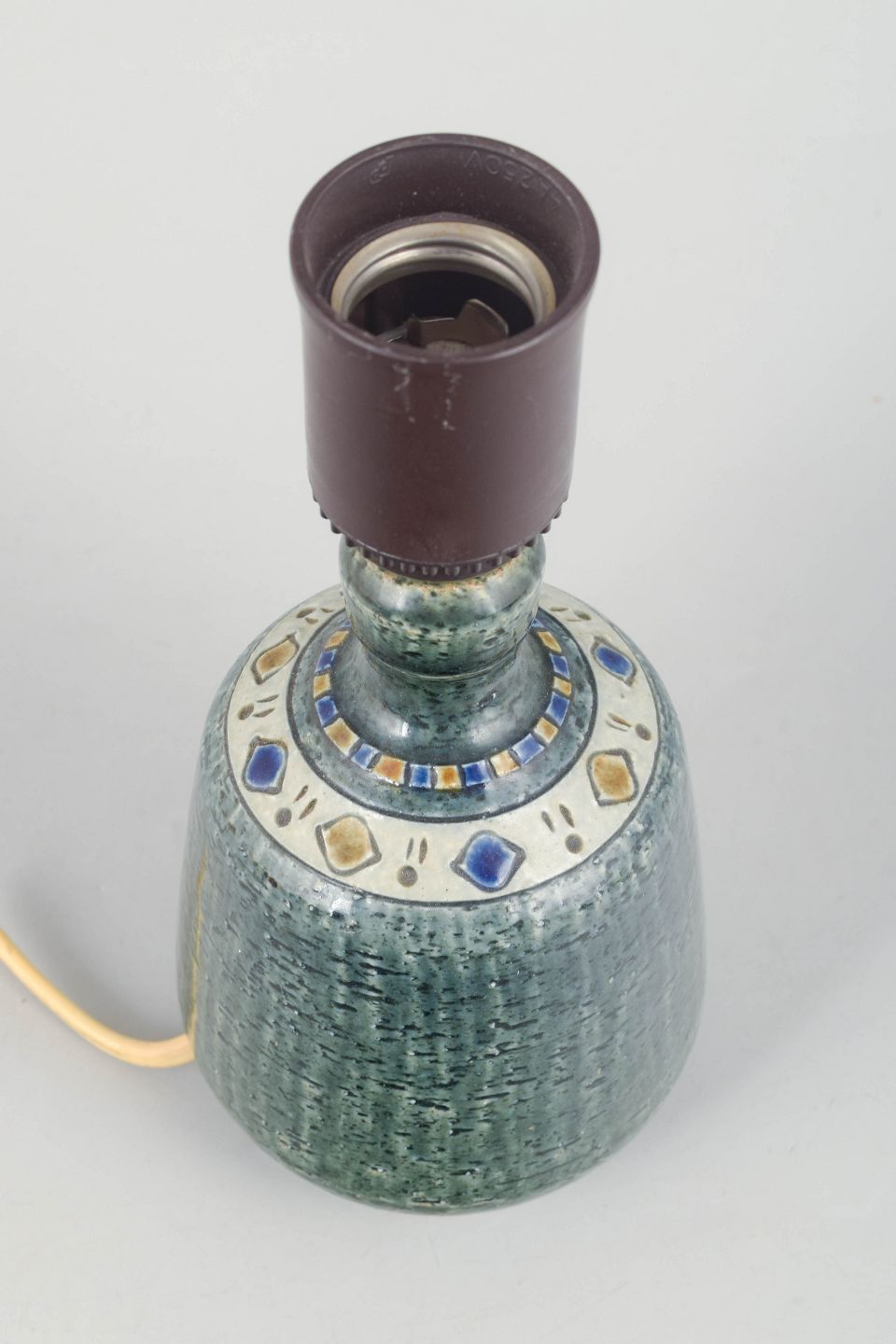 Dekorativ bordlampe i stentøj med karakteristisk reliefmønster og grøn glasur, monteret med lys fatning. Kort ledning uden stik.