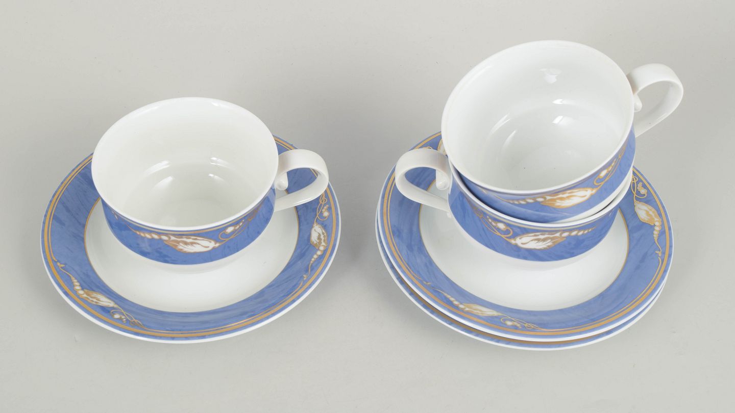 Royal Copenhagen Blå Magnolia, sæt af tre tekopper med tilhørende underkopper.