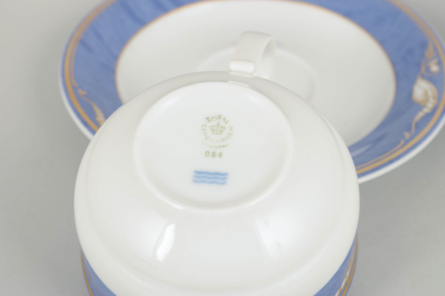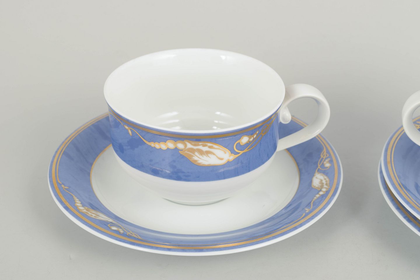 Elegante tekopper i porcelæn med Blå Magnolia dekoration, model 084 og 085, fremstillet i 1990’erne. Første sortering og fabriksstemplet.