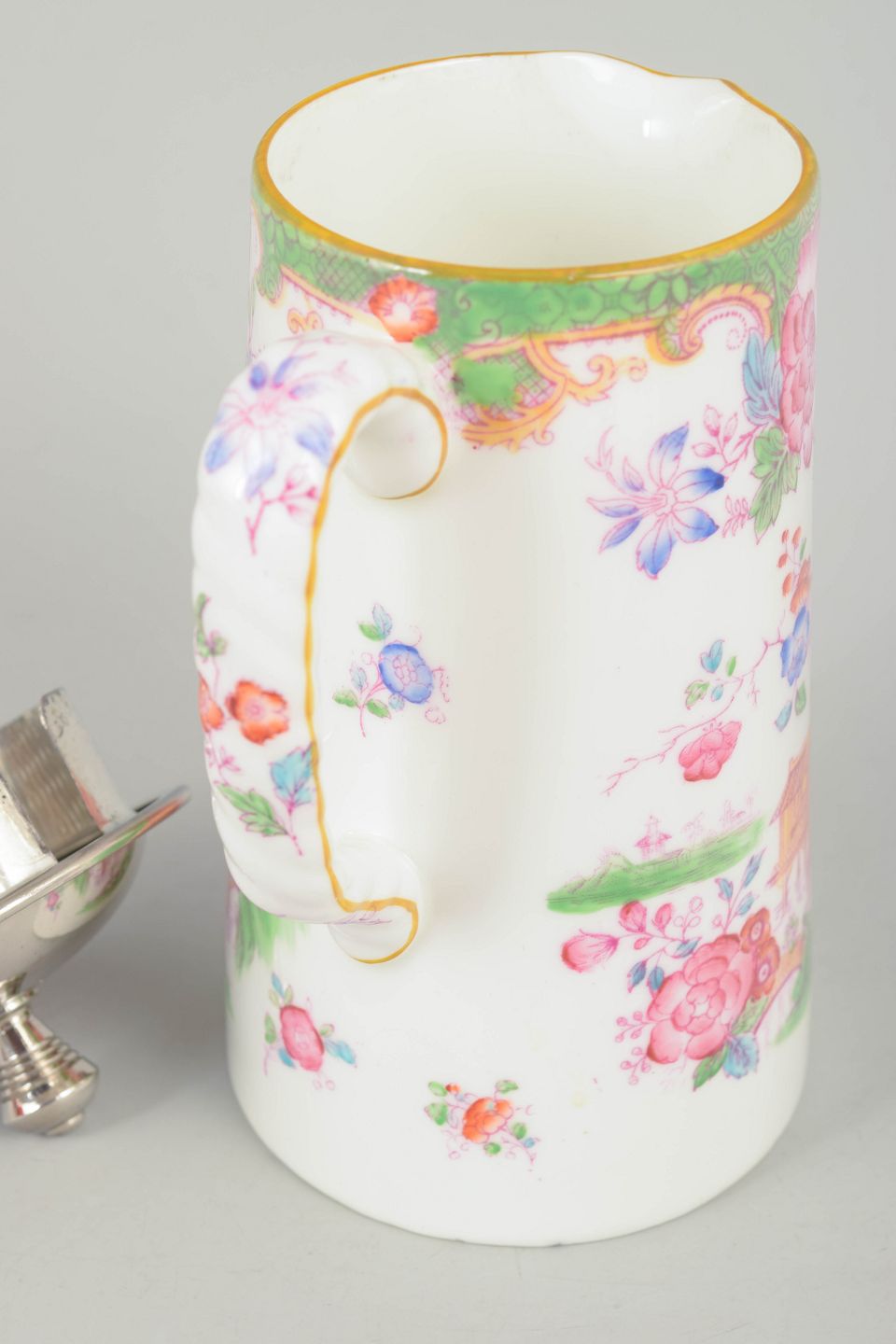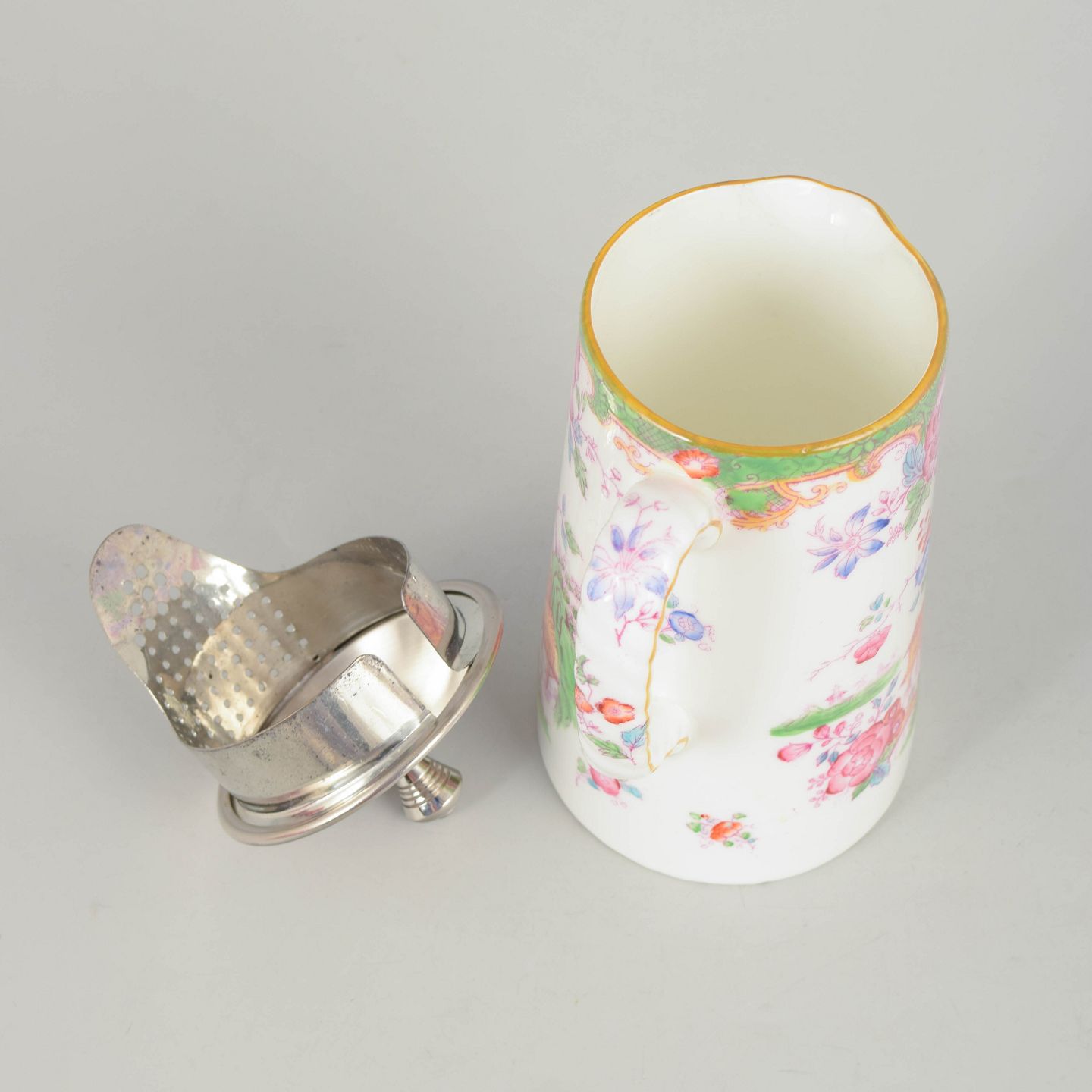 Decorative porcelain pitcher with colourful floral decoration in the Temple pattern, fitted with a stainless steel lid and an elegantly curved handle.