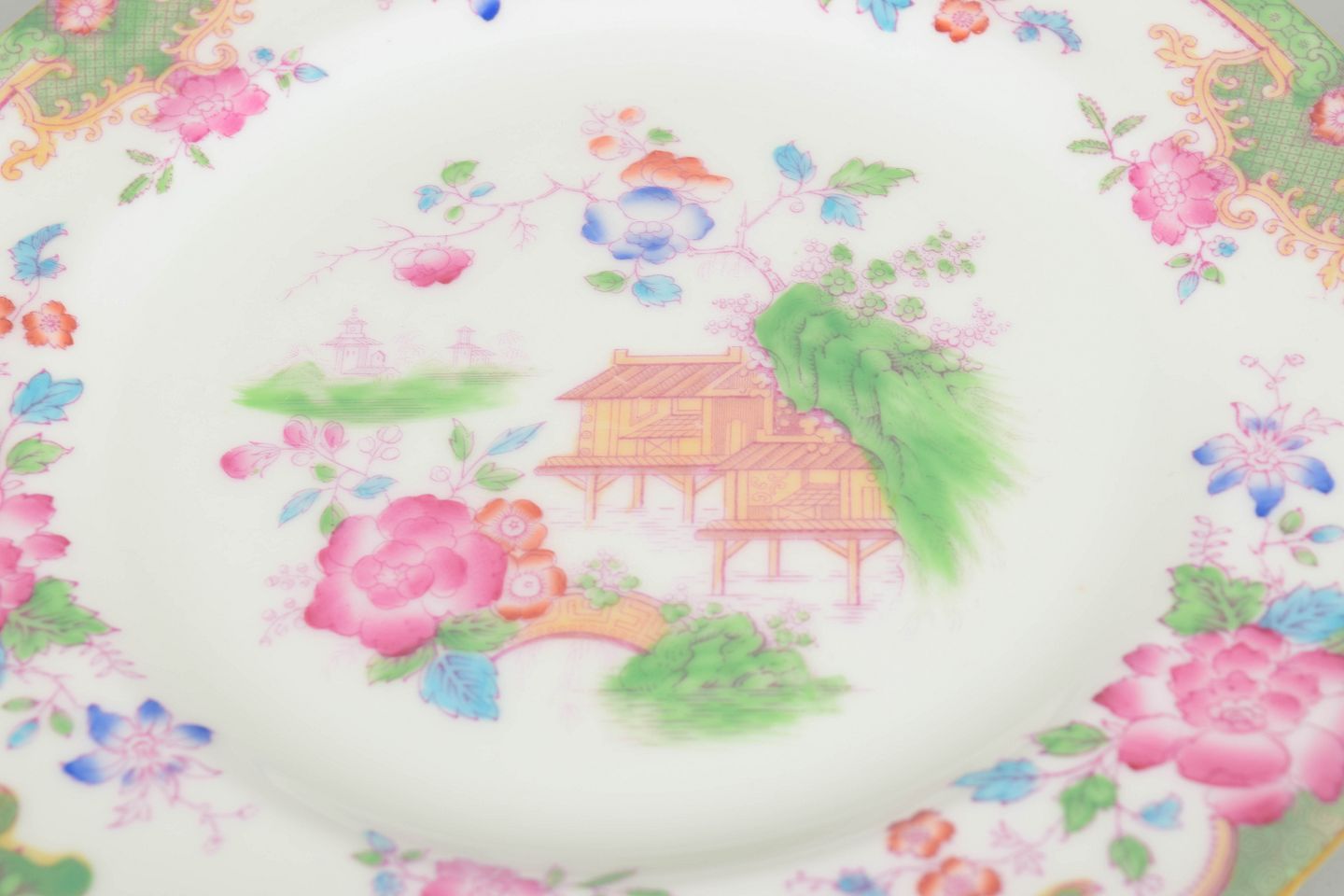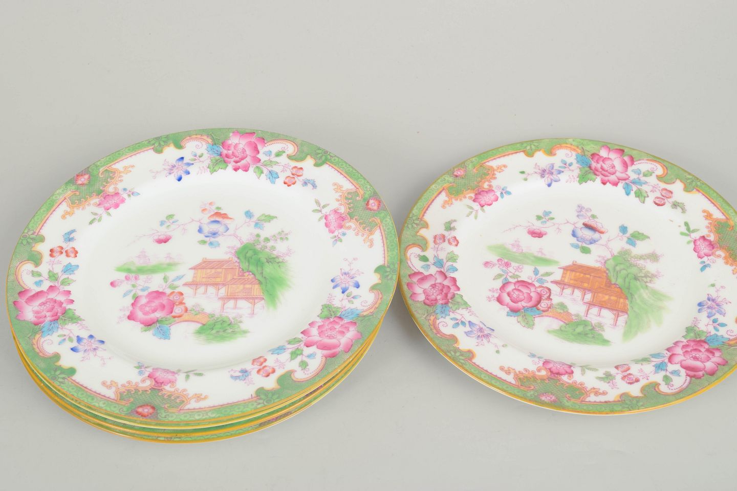 Decorative porcelain salad plates with colourful floral and scenic decoration in the Temple pattern, featuring central oriental motifs and a green border.