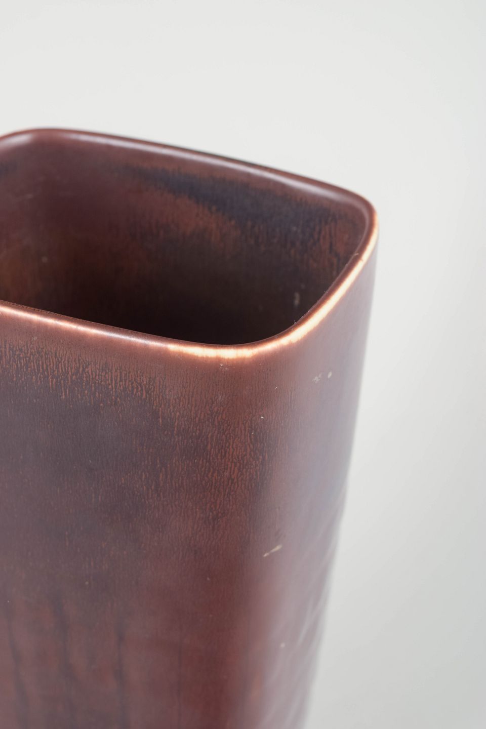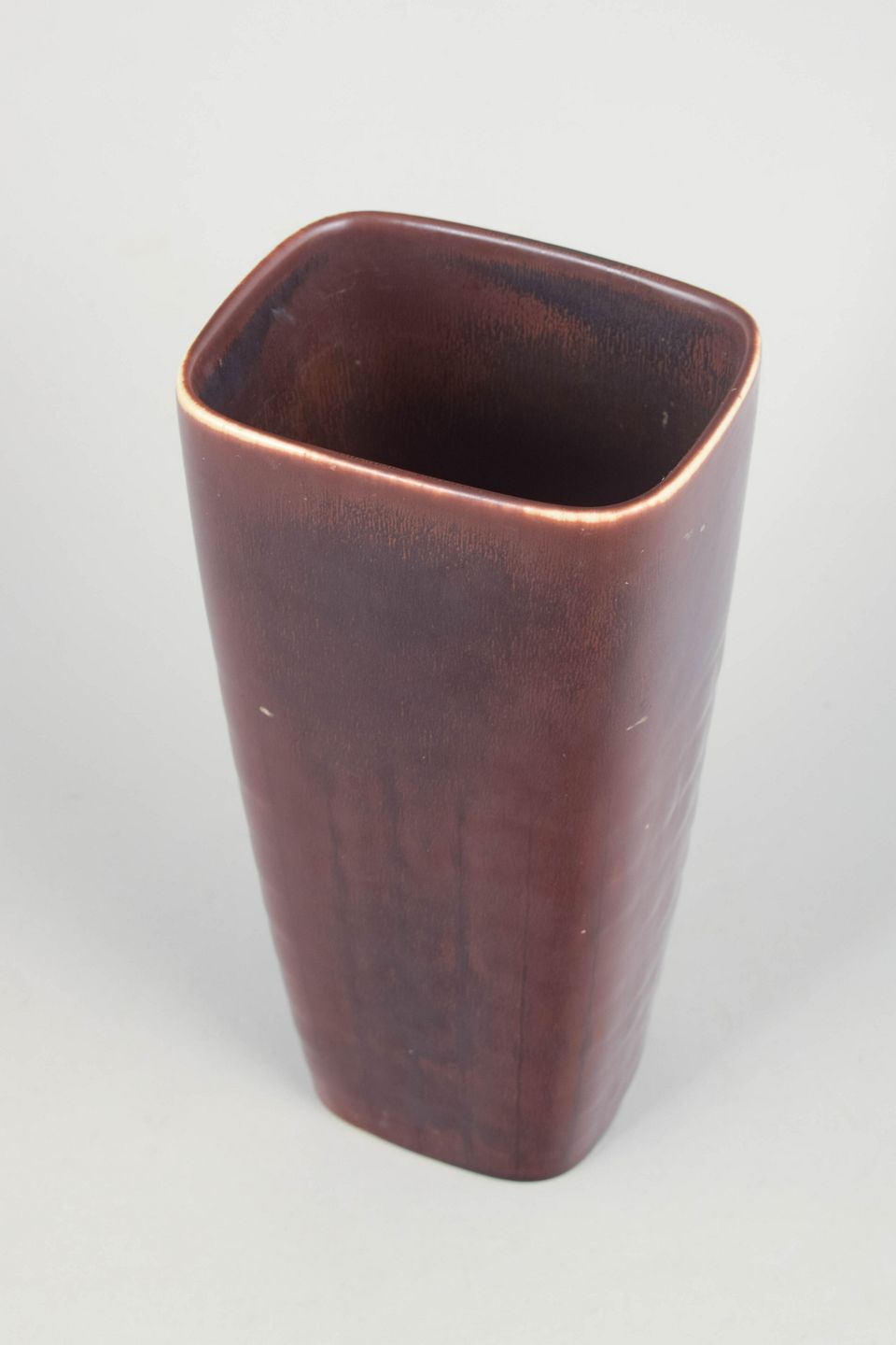 Stor, elegant vase i stentøj med let konisk form og dyb brun glasur med fine nuancer og blød overgang i overfladen. Et klassisk eksempel på Stålhane’s raffinerede formsprog og sikre glasurarbejde.