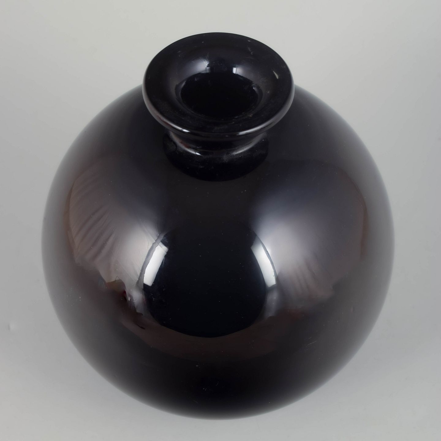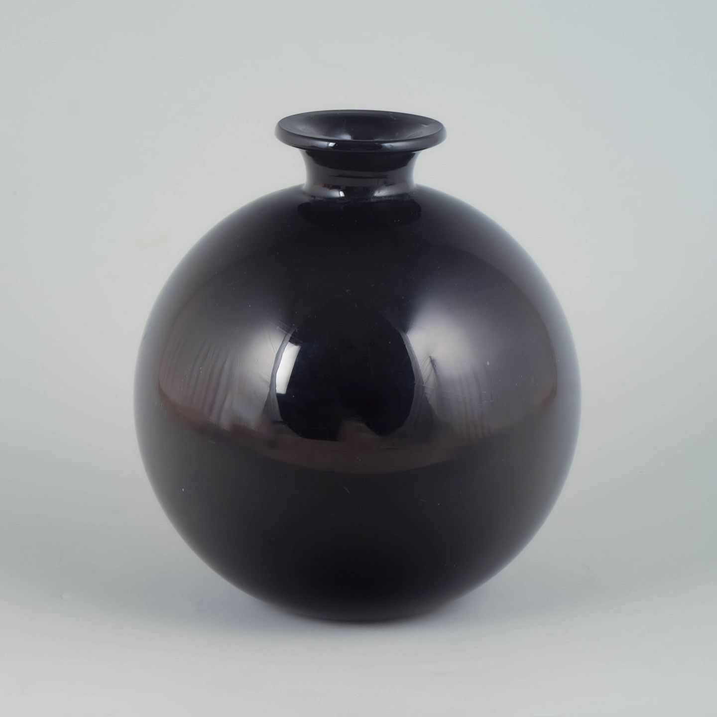 Elegant kugleformet vase med kort hals udført i mørktonet glas med højglans overflade, typisk for art deco perioden.