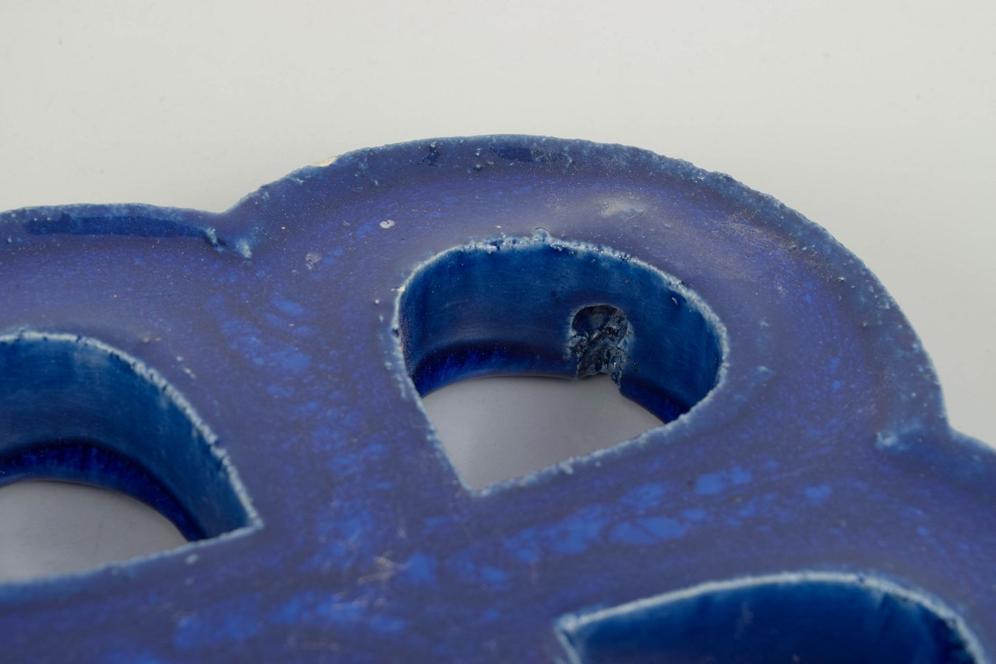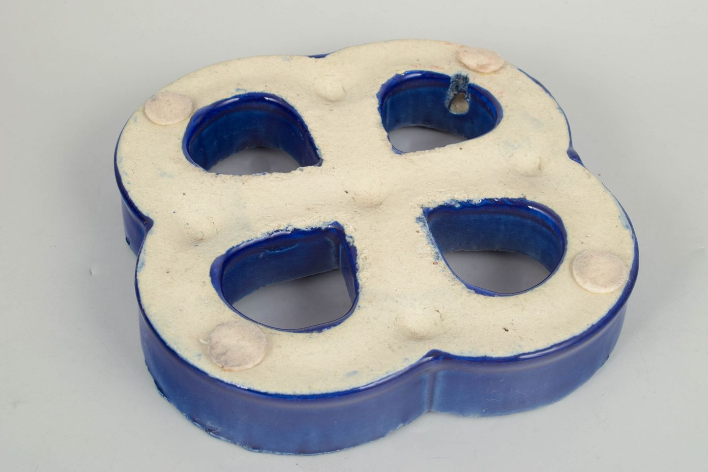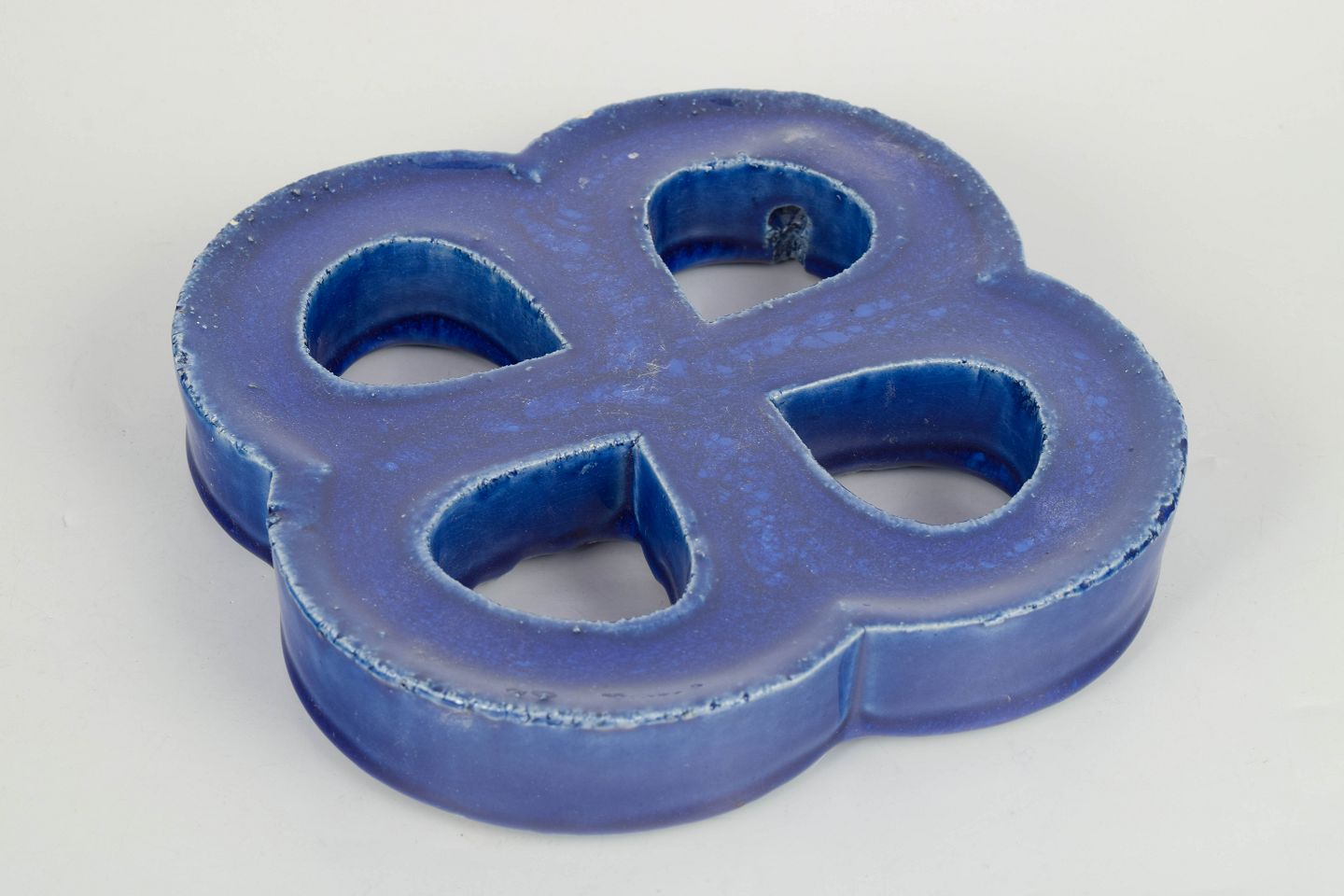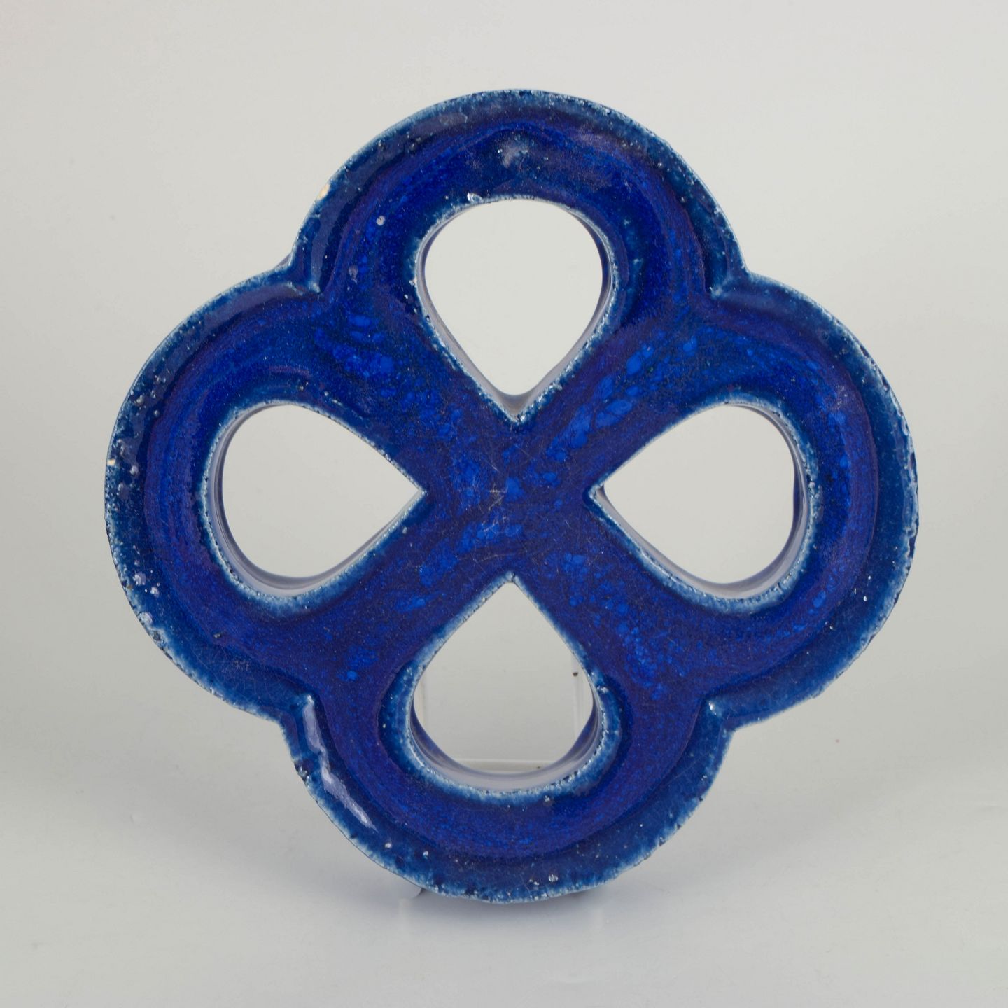 Dekorativt vægrelief i stentøj med organisk firkløverform og gennemgående åbninger. Udført med dyb blå, levende glasur med bobleeffekt og variation i overfladen. Bagside med hul til ophæng.