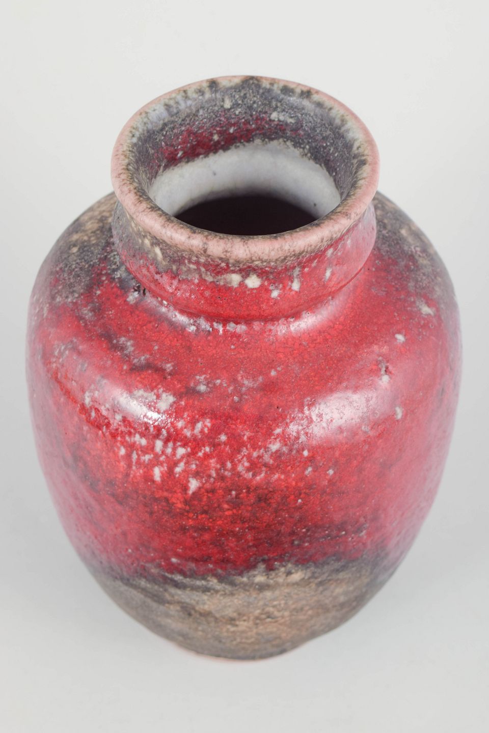 Vase i keramik med karakteristisk lava-glasur i dybrøde og mørke nuancer, med kraftig tekstur og organisk overflade. Model 7321.